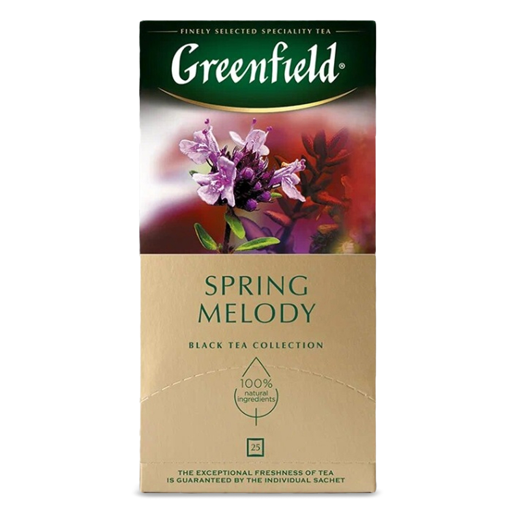 Приятная терпкость, присущая дорогим сортам индийского чая, пряный оттенок чабреца и прохладная мятная нотка создают неповторимый букет Greenfield Spring Melody — легкий, яркий и свежий, как дыхание весны. Нежный аромат, в котором слышится благоухание душистых трав, подчеркивает индивидуальность вкуса. Хорошо освежает и утоляет жажду.