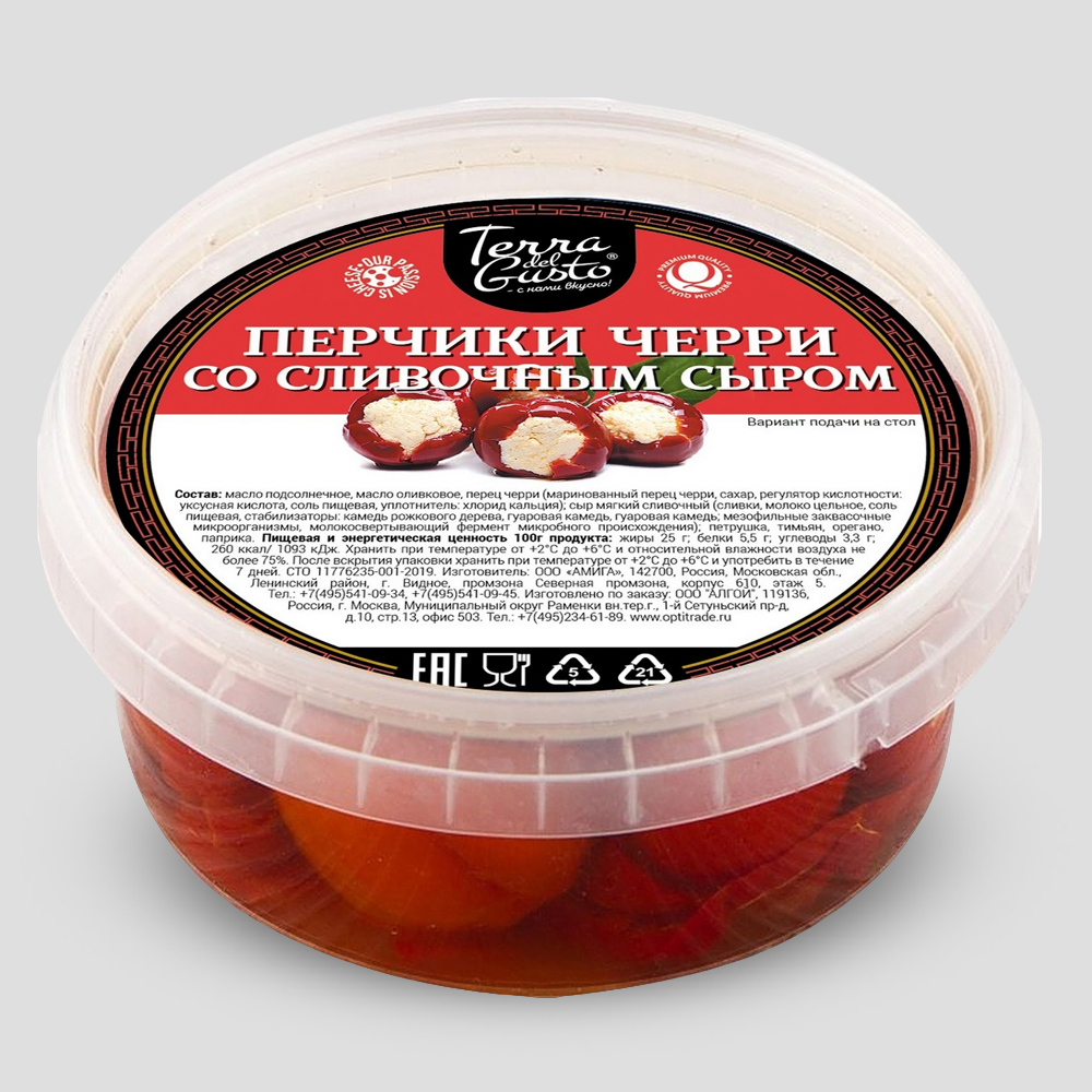 Масло подсолнечное; масло оливковое; сыр мягкий сливочный(сливки, молоко цельное, соль пищевая, стабилизаторы -камедь рожкового дерева, гуаровая камедь, мезофильные заквасочные микроорганизмы, молокосвертывающий фермент микробного происхождения.); перец черри-перец Черри, сахар, уксусная кислота 10%,соль пищевая, уплотнитель- хлорид кальция; петрушка, тимьян, орегано, паприка