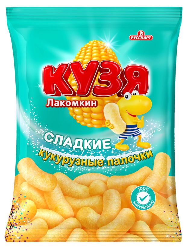 Порадуйте себя и своих детей сладкими кукурузными палочками Кузя Лакомкин от компании Русскарт. Воздушные палочки приготовлены из кукурузы отборных сортов высокого качества и имеют очень нежный вкус. Кукурузные снеки Кузя Лакомкин награждены множеством российских и международных наград, а также получили признание потребителей в передаче Контрольная закупка на Первом канале, где побеждали во всех передачах, посвященных кукурузным палочкам.