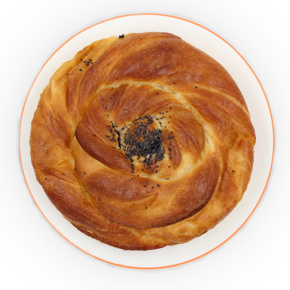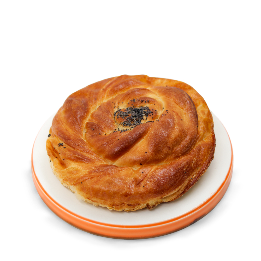 Тонко раскатанное сдобное тесто, свёрнуто в улитку с большим количеством начинки.