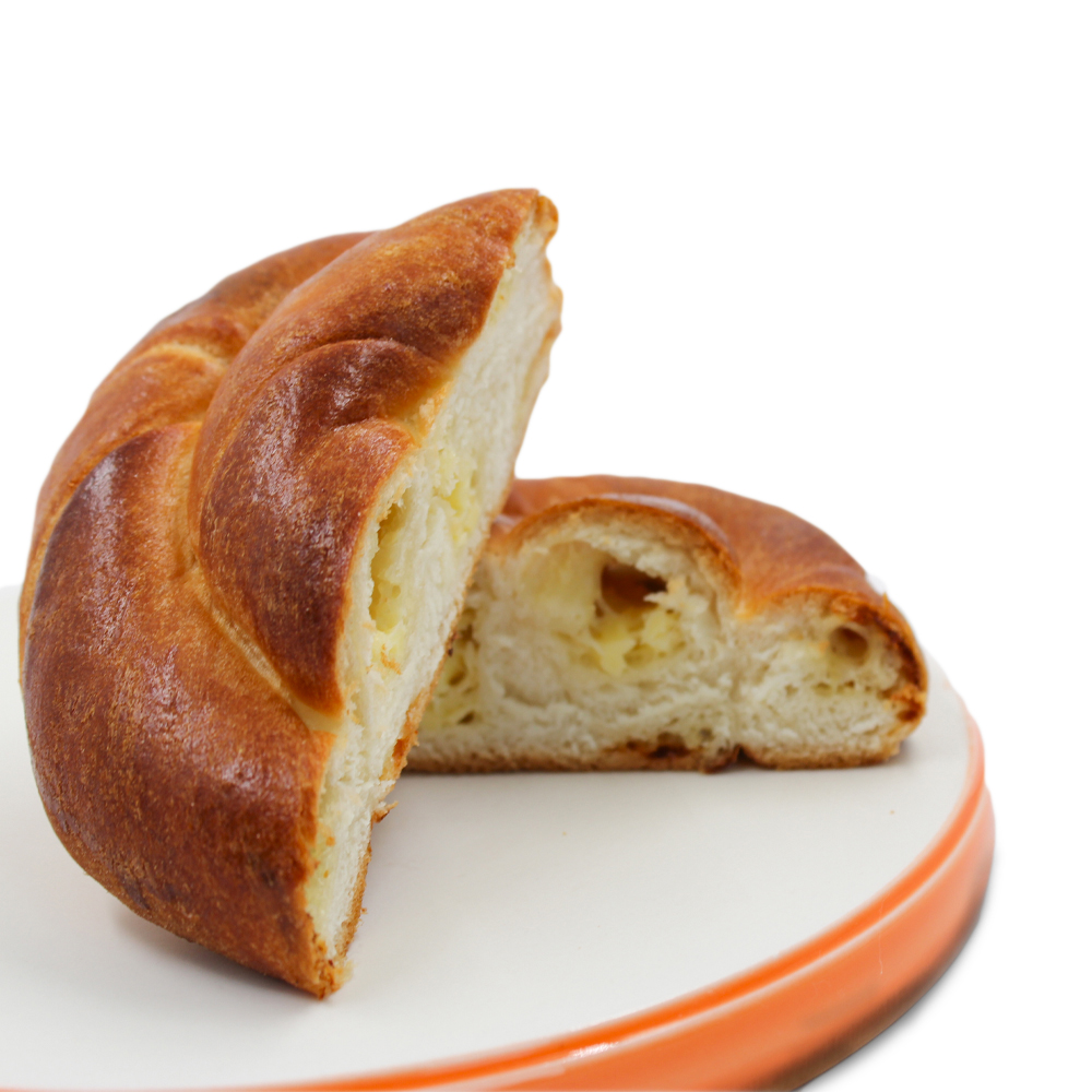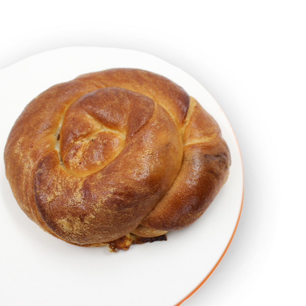Тонко раскатанное сдобное тесто, свёрнуто в улитку с начинкой из трех вкусных сыров.