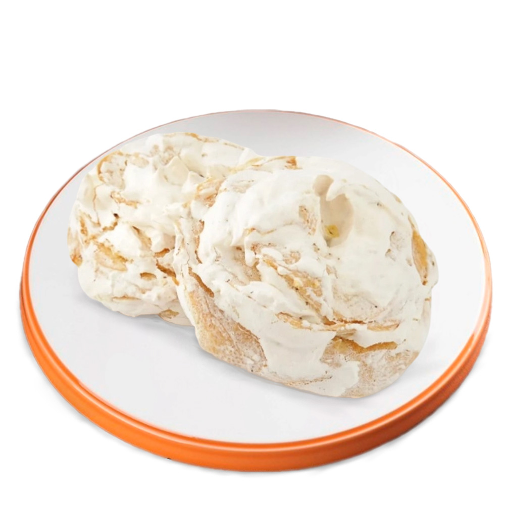 Воздушное сметанное тесто, покрыто безе с добавлением изюма. Хрустящее снаружи и мягкое внутри.