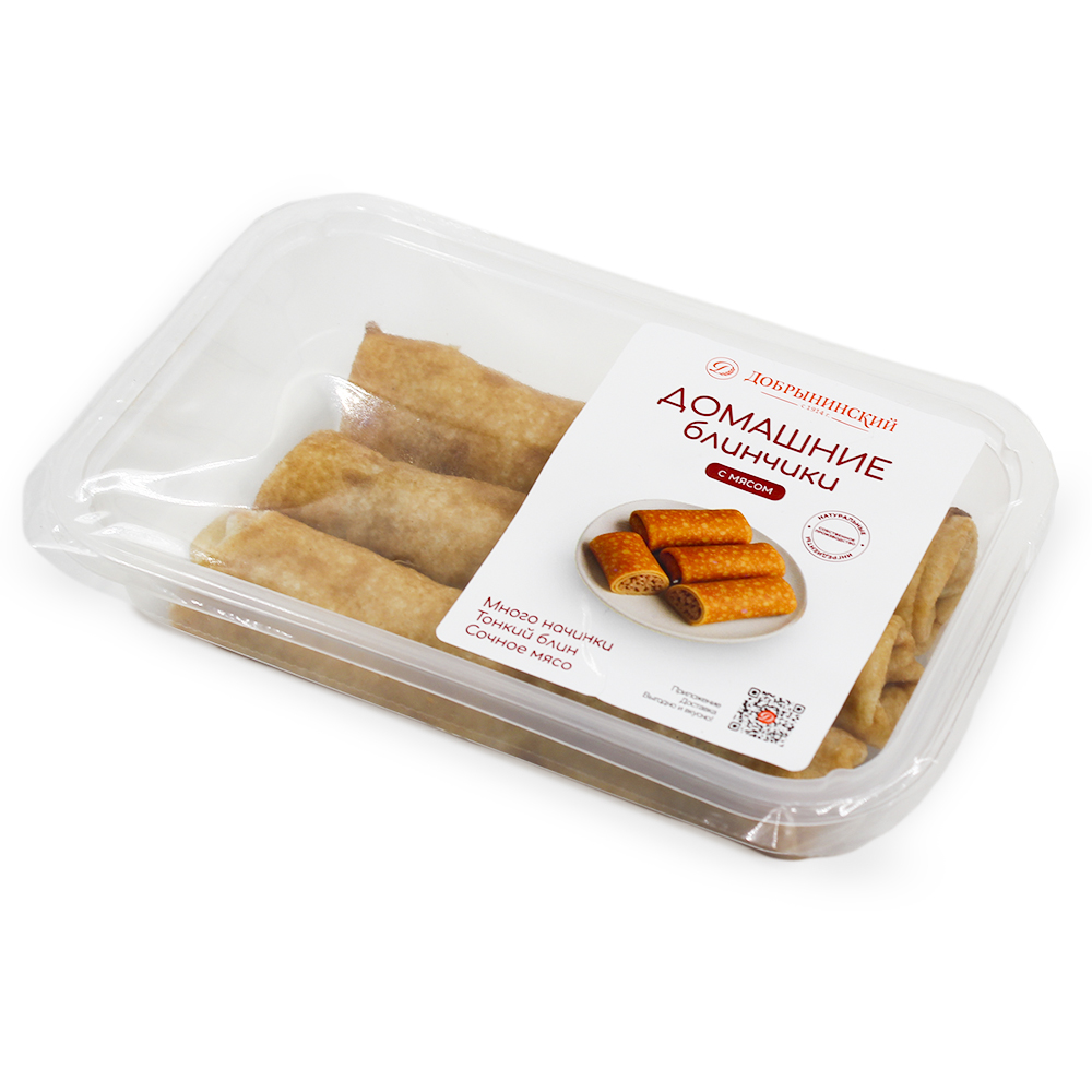 Блинчики: вода, молоко питьевое, мука пшеничная в/с, яичный меланж, сахар-песок, масло растительное, соль; начинка: мясо говядины с/м, лук репчатый, масло сливочное, перец черный молотый.
