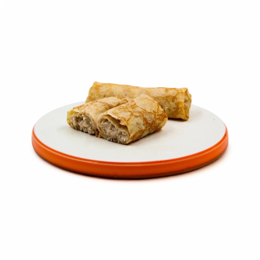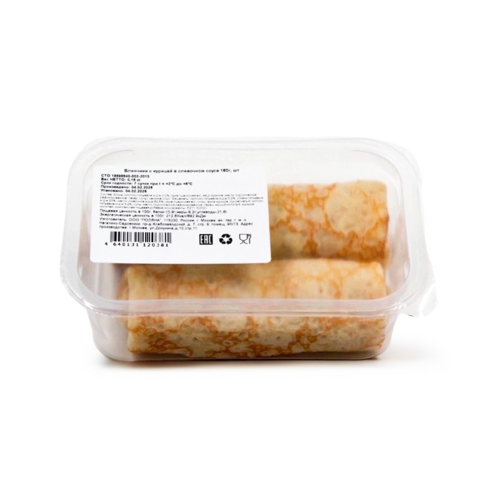 Блин (молоко питьевое м.д.ж. 3,2%, мука пшеничная в/с, яйцо куриное, масло подсолнечное рафинированное, сахар, соль), начинка (соус "Бешамель" (молоко питьевое м.д.ж. 3,2%, сливки питьевые м.д.ж. 33%, масло сливочное м.д.ж. 82,5%, мука пшеничная в/с, соль), филе куриное, лук репчатый, молоко питьевое м.д.ж. 3,2%, соль, масло подсолнечное рафинированное, перец черный молотый, куркума молотая, комплексная пищевая добавка (консерванты Е211, Е202)).
