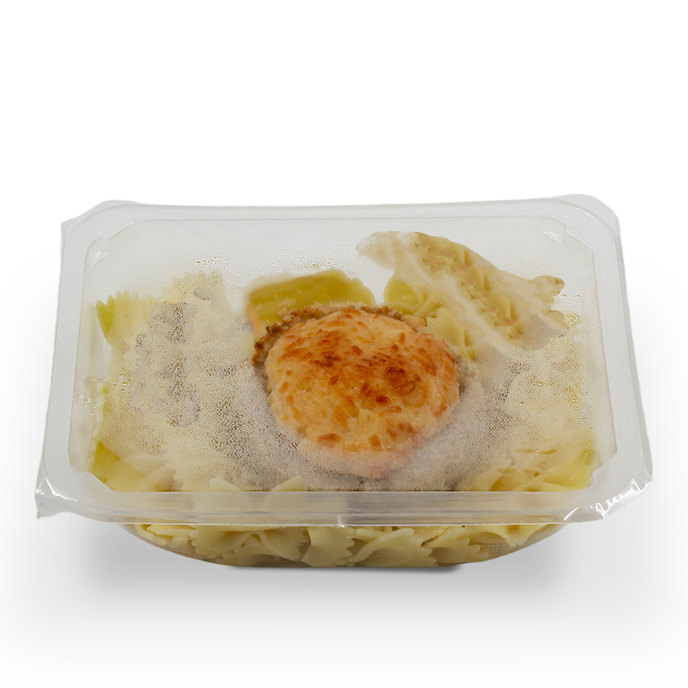 Оцените изысканный вкус ватрушки с куриным жюльеном и фарфалле — оригинальное блюдо для гурманов. Сочетание нежного куриного мяса, ароматных грибов и пасты фарфалле создаёт гармоничный вкус. Идеально подходит для быстрого обеда или ужина, достаточно разогреть.