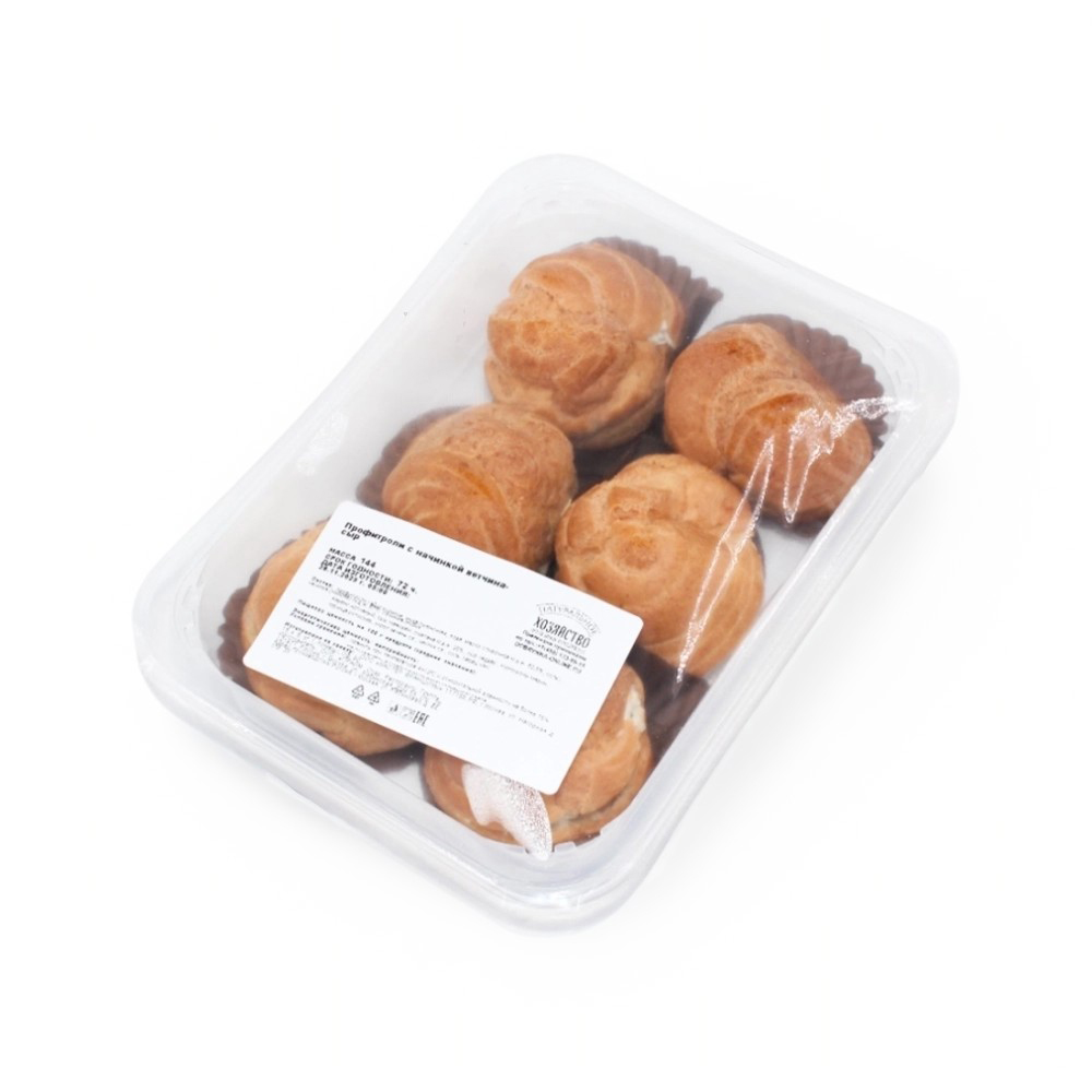 профитроли (яйцо куриное, мука пшеничная, вода, масло сливочное м.д.ж. 82,5%, соль), начинка (майонез м.д.ж. 67%, свинина окорок варено-копченый, сыр маасдам, сметана м.д.ж. 26%, сыр чеддер , корнишоны марин., горчица ротисьер, укроп зелень св., чеснок св., соль, перец ч/м). Может содержать следы арахиса, горчицы, орехов, кунжута, моллюсков, молочных продуктов, ракообразных, рыбы, сельдерея, сои, яиц, злаков, содержащих глютен. Упаковано в модифицированной газовой среде. Будьте осторожны, возможно попадание костей.