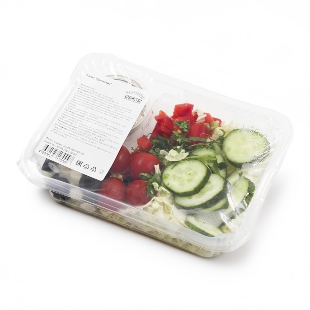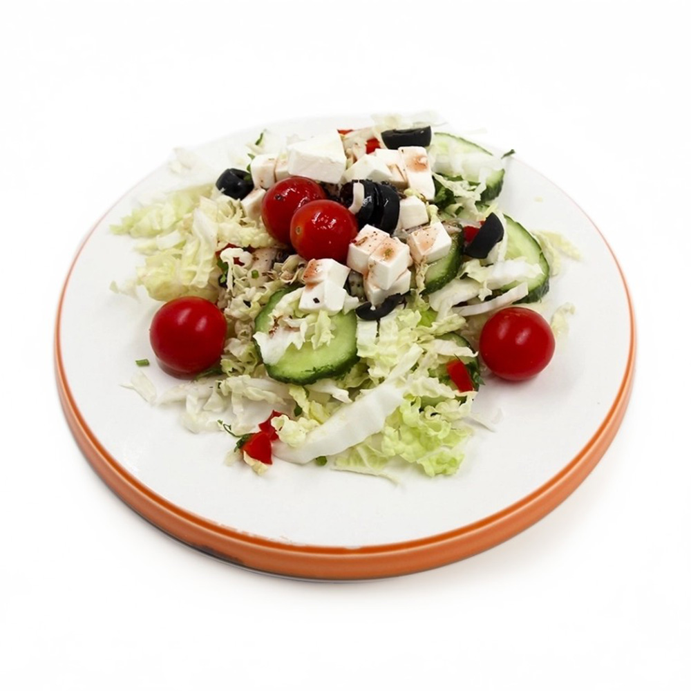 Огурцы свежие, капуста пекинская свежая, томаты черри, плавленый сырный продукт Фетакса, перец болгарский, маслины консервированные, зелень петрушка свежая. Соус (масло подсолнечное рафинированное, оливковое масло, сироп малиновый, концентрат лимонного сока, бальзамический соус-крем, соль, сахар, прованские травы (розмарин, базилик, орегано, чабер, мята, майоран))