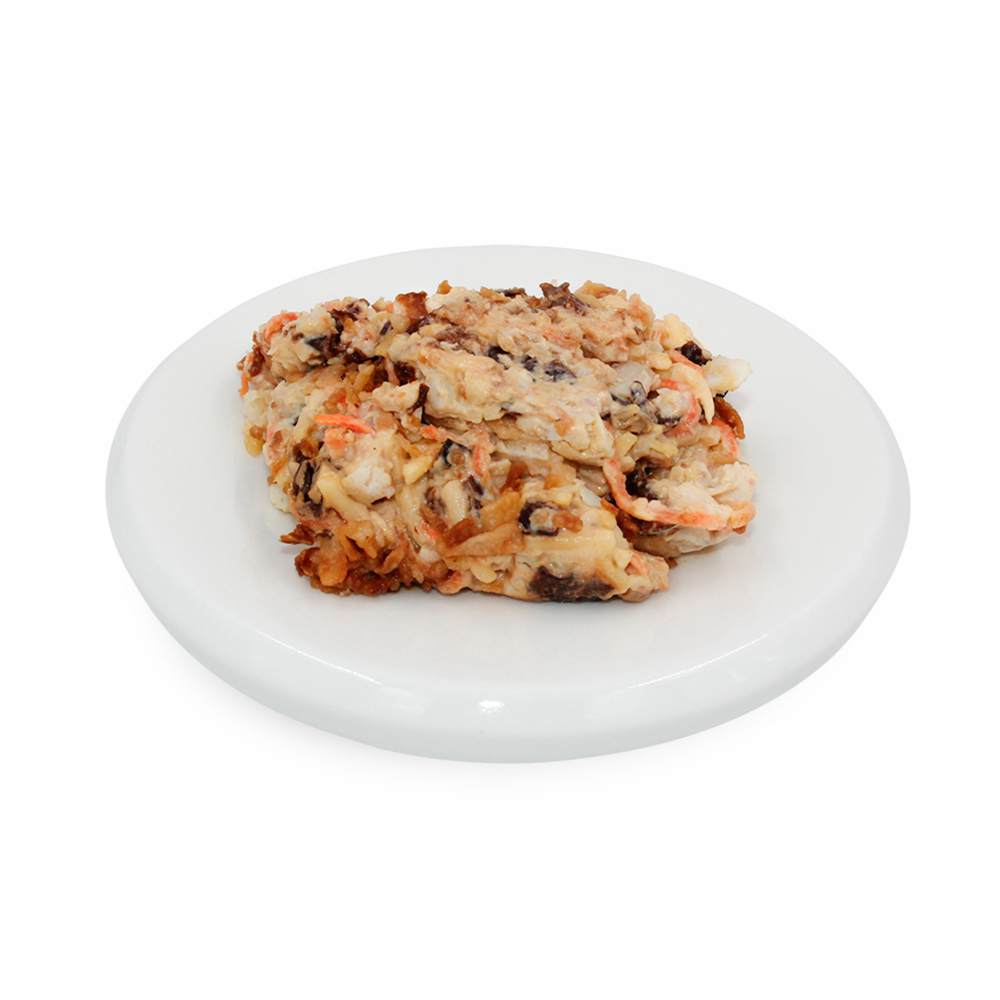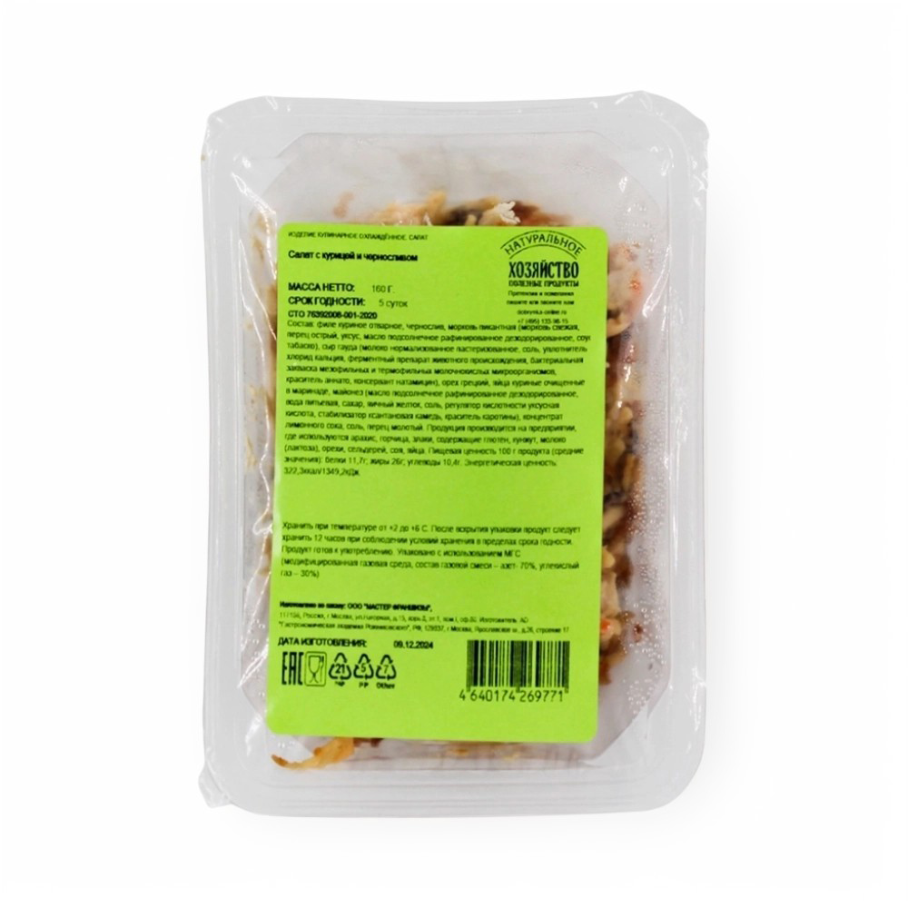 Филе куриное отварное, чернослив, морковь пикантная (морковь свежая, перец острый, уксус, масло подсолнечное рафинированное дезодорированное, соу табаско), сыр гауда (молоко нормализованное пастеризованное, соль, уплотнитель хлорид кальция, ферментный препарат животного происхождения, бактериальная закваска мезофильных и термофильных молочнокислых микроорганисмов, краситель аннато, консервант натамицин), орех грецкий, яйца куриные очищенные в маринаде, майонез (масло пюдсолнечное рафинированное дезодорированное, вода питьевая, сахар, яичный желток, соль, регулятор кислотности уксусная кислота, стабилизатор ксантановая камедь, краситель каротины), концентрат лимонного сока, соль, перец молотый. Продукция производится на предприятии, где испюльзуются арахис, горчица, злаки, содержащие глютен, кунжут, молоко (лактоза), орехи, сельдерей, соя, яйца.