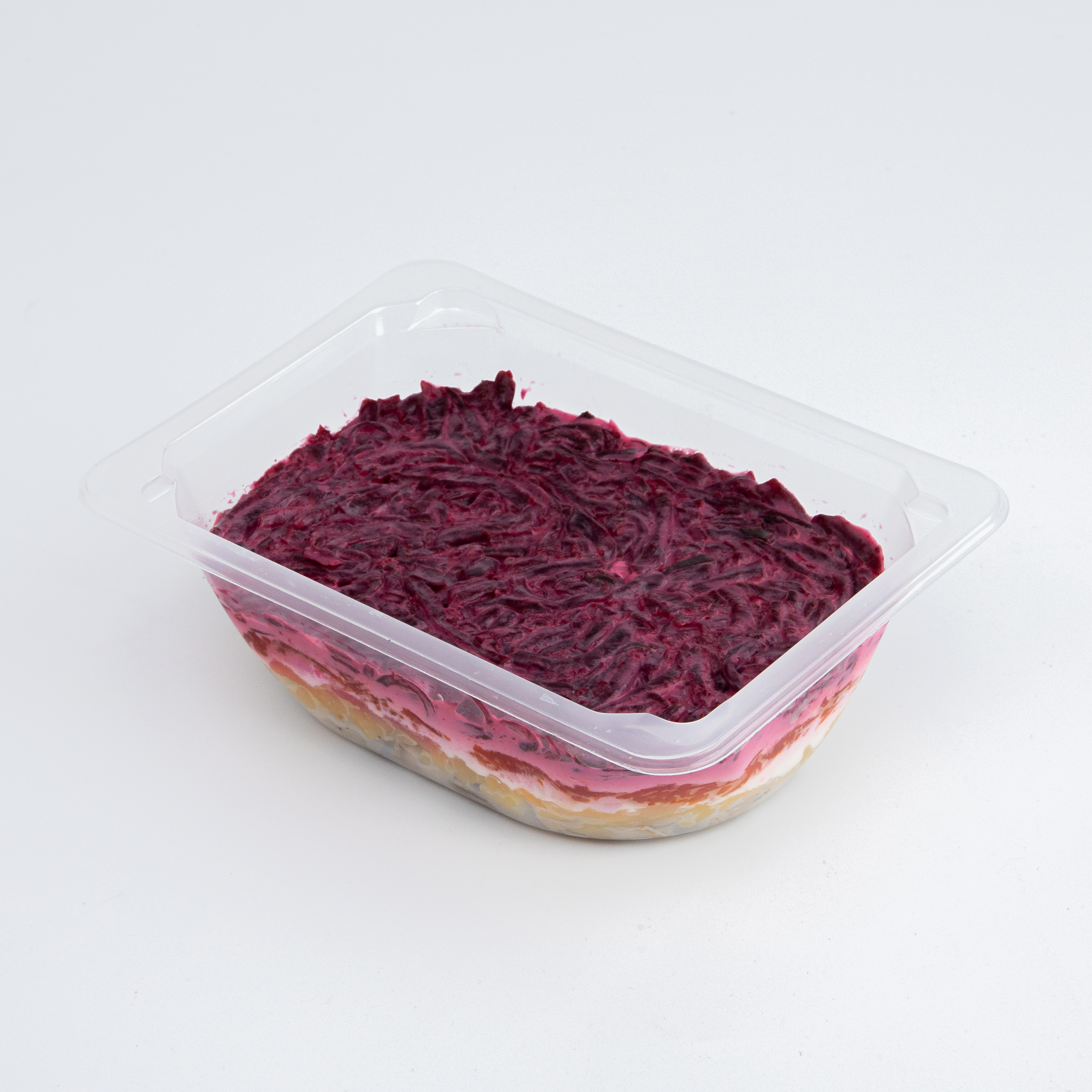 Майонез (масло подсолнечное рафинированное дезодорированное, вода, сахар, яичный желток, соль, загуститель крахмал модифицированный, регулятор кислотности уксусная кислота, консервант сорбиновая кислота, стабилизатор ксантановая камедь, ароматизатор, антиокислитель ЭДТА, кальций-натрий, краситель бета-каротин), филе сельди, свекла, картофель, морковь, яйцо куриное.