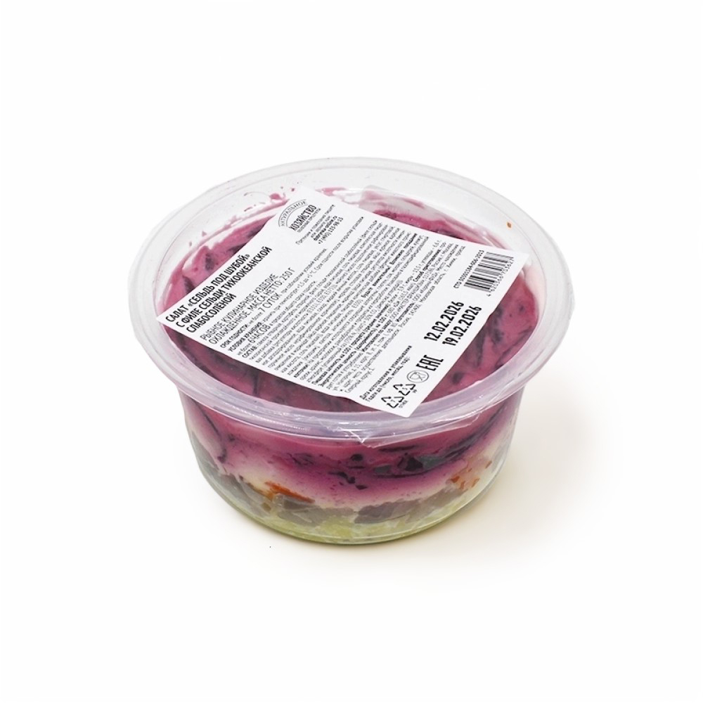 Свекла столовая отварная, картофель отварной, филе сельди тихоокеанской слабосолёной (филе сельди тихоокеанской произведённого из мороженого сырья, вода питьевая, соль пищевая, комплексная пищевая добавка (регуляторы кислотности (Е331ii, Е330, Е575))), майонез (масло подсолнечное рафинированное дезодорированное, вода питьевая, сахар, жидкий яичный желток, соль пищевая, уксус спиртовой, горчичное масло нерафинированное коричневое), морковь столовая отварная, яйцо куриное варёное очищенное в маринаде (яйцо варёное очищенное, маринад (вода питьевая, регулятор кислотности лимонная кислота, соль пищевая)), вода питьевая, пищевая комплексная добавка (фермент животного происхождения (лизоцим), лактоза, антиокислитель Е330). Произведено из мороженого сырья. Будьте внимательны! Возможно попадание косточки!