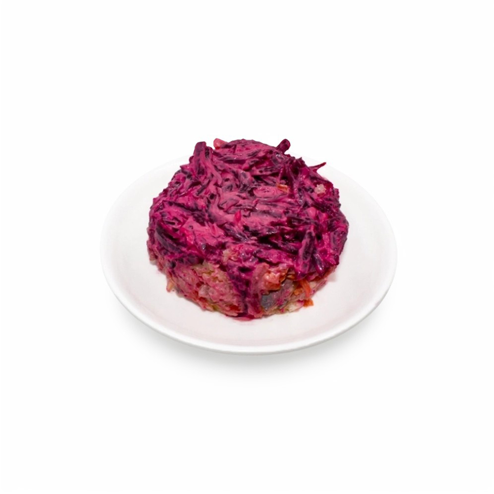 Классическая «Шуба» в обновлённой интерпретации — плотные слои отварных овощей и нежной слабосолёной сельди, объединённые кремовой майонезной эмульсией. Празднично, сытно и по‑домашнему уютно.