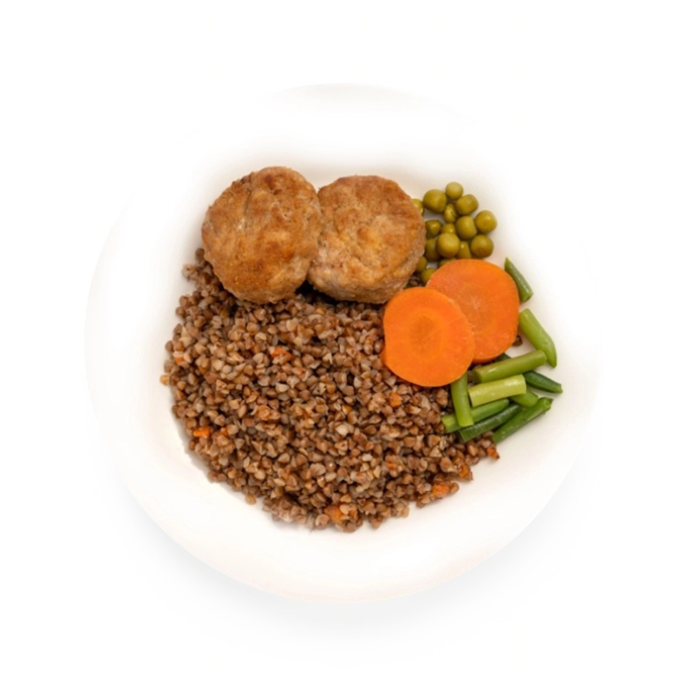 Откройте для себя вкус традиционной белорусской кухни с биточками и гарниром из гречки и овощей! Нежные биточки, приготовленные из смеси свинины и куриного бедра, с добавлением ароматных специй, чеснока и черного перца, обжарены до золотистой корочки. В сочетании с гречневой кашей, приготовленной с луком и морковью, они создают сытное и сбалансированное блюдо. А овощной микс из моркови, стручковой фасоли и зеленого горошка придаёт блюду яркость и свежесть. Петрушка завершает это блюдо, добавляя свежий аромат и пользу. Насладитесь классическим вкусом и питательностью!