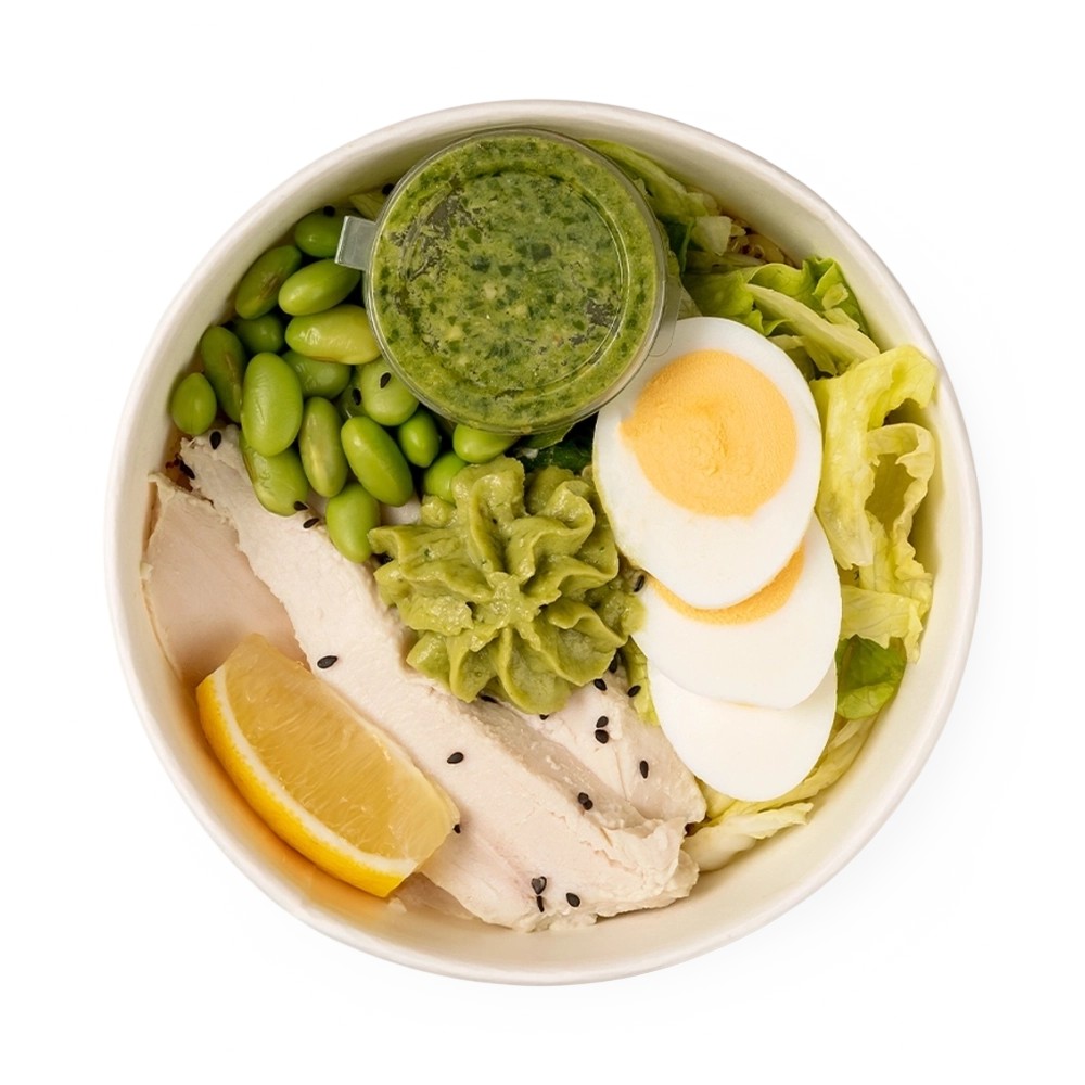 Сочное куриное филе, приготовленное по технологии су-вид, сохраняет нежность и естественную сочность, а пикантный соус с васаби добавляет тонкую остроту и глубину вкуса. Смесь свежих салатных листьев делает боул легким и освежающим, а зеленые бобы придают дополнительную питательность.