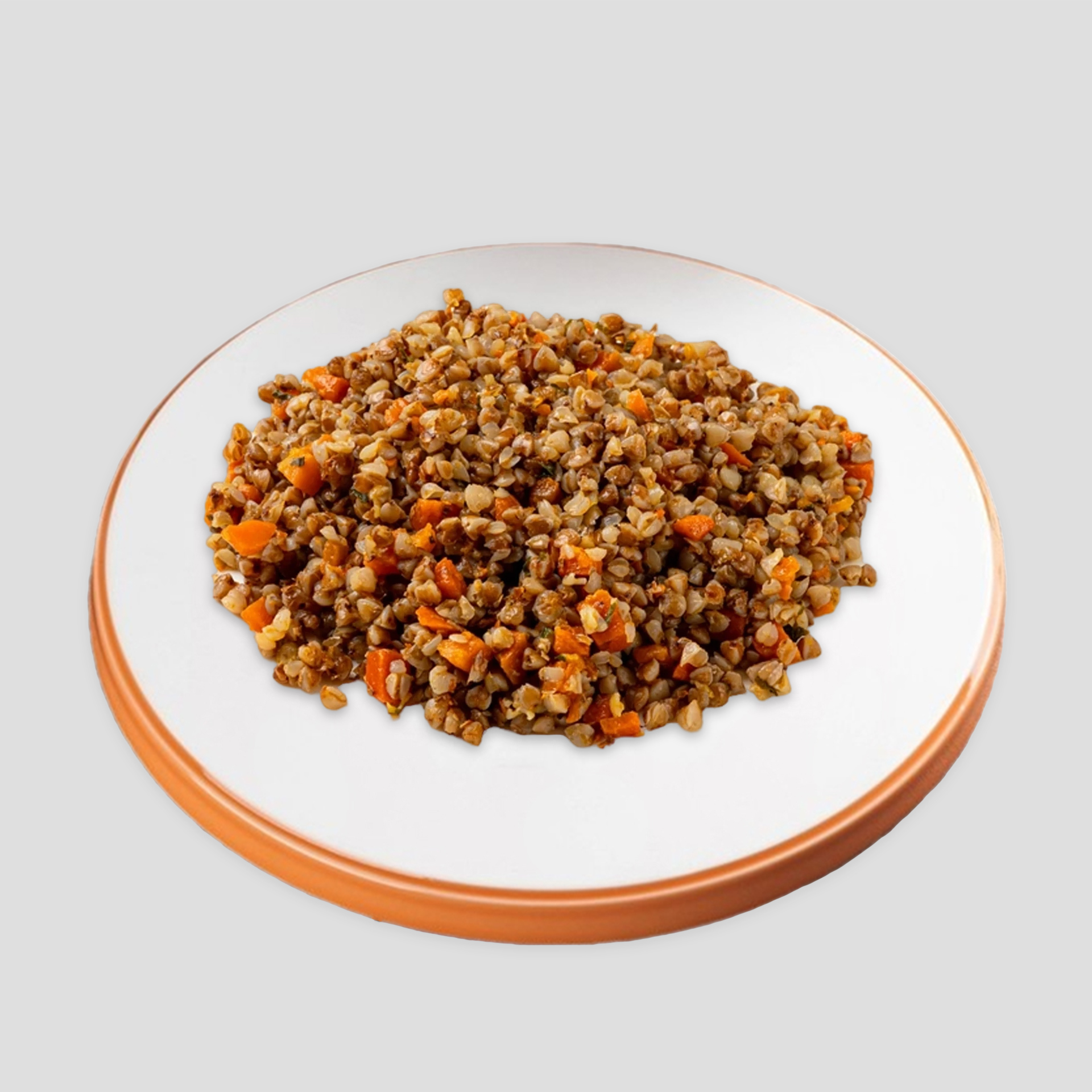 Крупа гречневая отварная (крупа гречневая ядрица, вода питьевая, соль пищевая), морковь столовая свежая, лук репчатый свежий, масло подсолнечное рафинированное дезодорированное, петрушка свежая (зелень). Продукция производится на предприятии, где используются аллергены: арахис, горчица, злаки, содержащие глютен, кунжут, ракообразные, рыба, молоко (лактоза), орехи, сельдерей, соя, яйца.