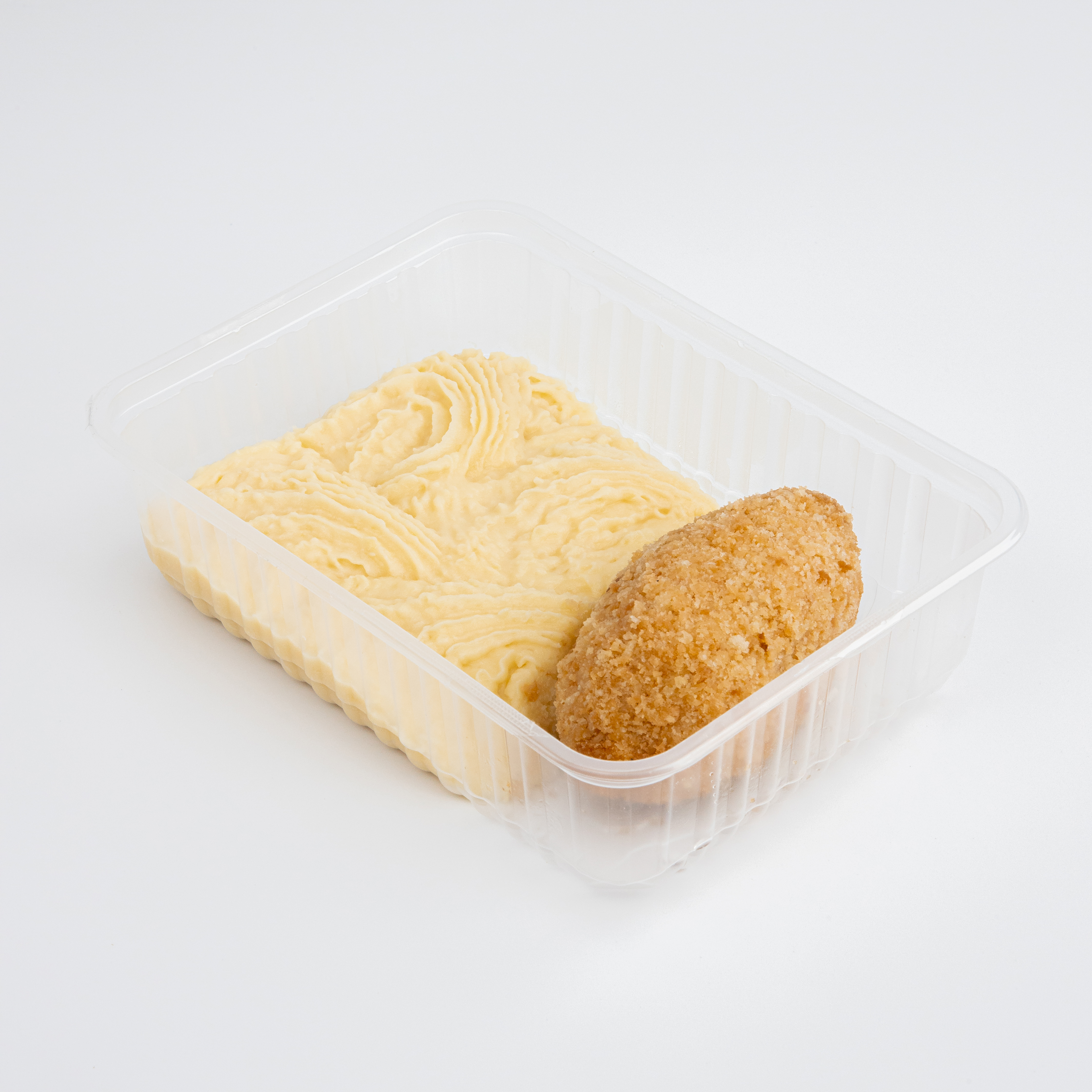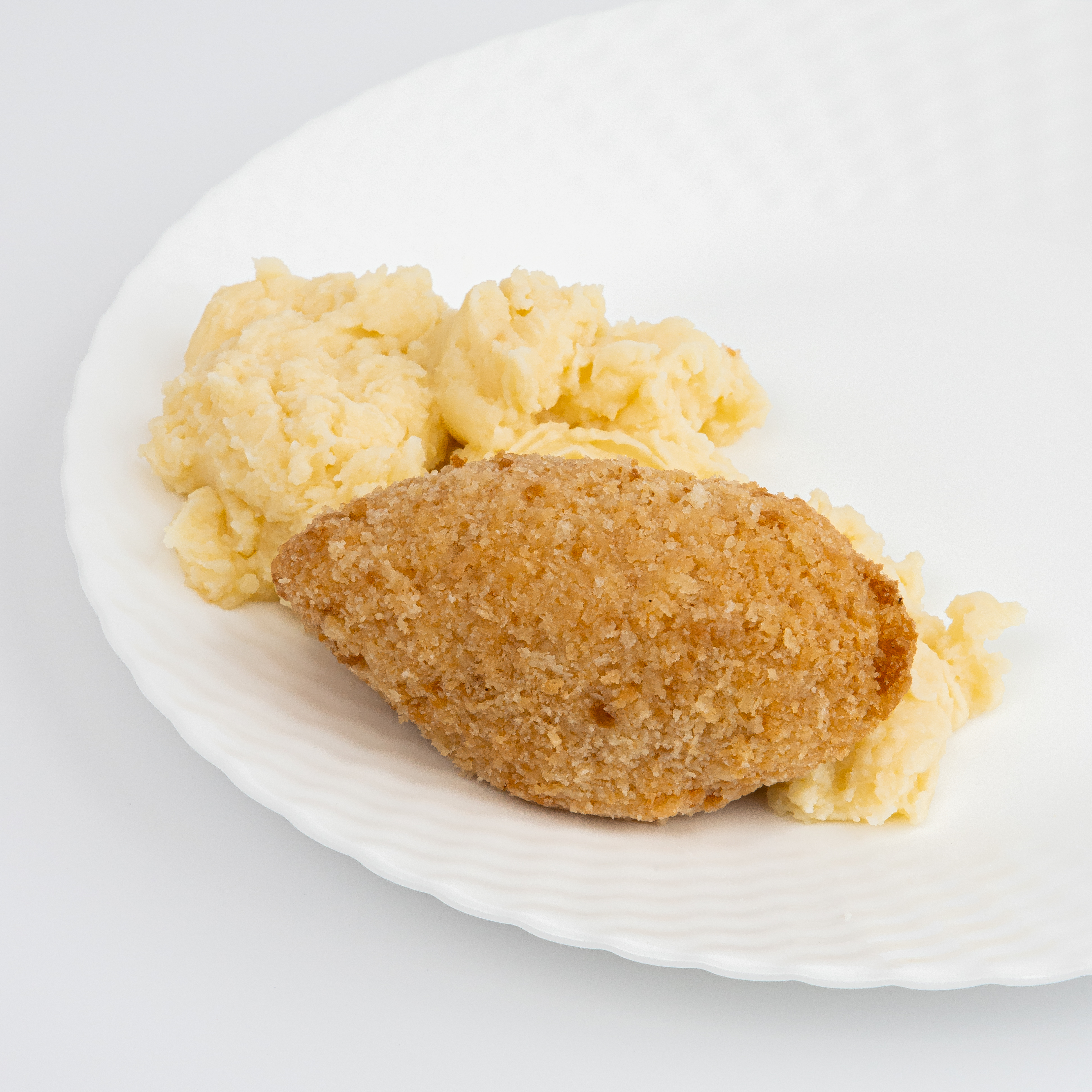 Филе куриной грудки, панировка (мука пшеничная в/с, вода питьевая, яйцо куриное, сахар, масло подсолнечное, дрожжи, соль), масло сливочное, масло подсолнечное, соль, чеснок, укроп; картофель, молоко 3,2%, масло сливочное (сливки пастеризованные) , соль пищевая, сахар.