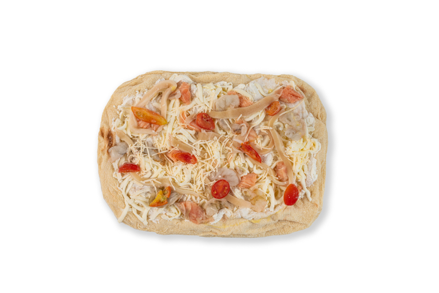 Корж для пиццы (мука из мягких сортов пшеницы типа «О», мука из твердых сортов пшеницы, мука рисовая, мука соевая, закваска пшеничная (мука из мягких сортов пшеницы типа «О», альфа амилаза), закваска ржаная (мука из мягких сортов ржи типа «О», альфа амилаза), средство для обработки муки: аскорбиновая кислота, масло подсолнечное рафинированное дезодорированное, вода питьевая, соль пищевая, дрожжи хлебопекарные), сыр "Моцарелла" м.д.ж. в сухом веществе 40 % (Молоко нормализованное пастеризованное, соль пищевая, уплотнитель – хлорид кальция, бактериальная закваска термофильных и мезофильных микроорганизмов, молокосвертывающий фермент микробного происхождения), соус Кремчиз (сыр сливочный Кремчиз м.д.ж. в сухом веществе 70 % (сливки нормализованные пастеризованные, соль пищевая, мезофльные бактериальные закваски), вода питьевая, соль пищевая, чеснок сухой), лосось атлантический (семга), креветки белоногие, кальмар командорский, томаты (черри) свежие, масло оливковое нерафинированное первого холодного отжима высшего качества, сыр "Пармезан классический" м.д.ж. в сухом веществе 45 % (Молоко нормализованное пастеризованное, соль пищевая, уплотнитель – хлорид кальция, бактериальная закваска термофильных и мезофильных микроорганизмов, молокосвертывающий ферментный препарат животного происхождения)