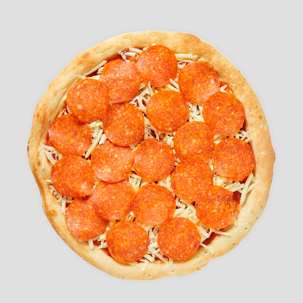 Основа для пиццы отпеченная (мука пшеничная хлебопекарная высшего сорта, вода питьевая, мука пшеничная ферментированная, мука соевая, крупа манная, соль поваренная пищевая, сахар, дрожжи сухие), томатный соус (томаты очищенные, сахар, оливковое масло, соль поваренная пищевая, перец черный молотый), сыр мягкий Моцарелла ностра тертый м.д.ж. в сух. вещ-ве 40% (молоко нормализованное пастеризованное, соль поваренная пищевая, закваска термофильных молочнокислых микроорганизмов, молокосвертывающий ферментный препарат микробного происхождения, регулятор кислотности – лимонная кислота), изделие колбасное с/к колбаса п/с Пепперони (свинина, говядина, шпиг, соевый белок, соль поваренная пищевая, специи и экстракты специй, экстракт паприки, сахар, растительное масло, усилитель вкуса и аромата (глутамат натрия), антиокислитель (изоаскорбат натрия), пшеничные волокна, мальтодекстрин, ароматизатор, глюкоза, стартовые культуры, краситель красный рисовый), фиксатор окраски (нитрит натрия).