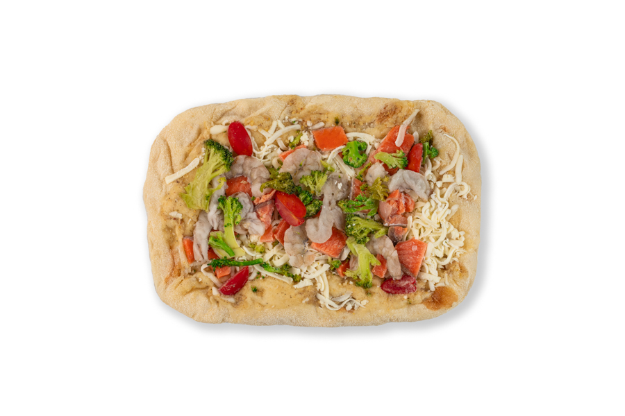 Корж для пиццы (мука из мягких сортов пшеницы типа «О», мука из твердых сортов пшеницы, мука рисовая, мука соевая, закваска пшеничная (мука из мягких сортов пшеницы типа «О», альфа амилаза), закваска ржаная (мука из мягких сортов ржи типа «О», альфа амилаза), средство для обработки муки: аскорбиновая кислота, масло подсолнечное рафинированное дезодорированное, вода питьевая, соль пищевая, дрожжи хлебопекарные), сыр "Моцарелла" м.д.ж. в сухом веществе 40 % (Молоко нормализованное пастеризованное, соль пищевая, уплотнитель – хлорид кальция, бактериальная закваска термофильных и мезофильных микроорганизмов, молокосвертывающий фермент микробного происхождения), лимонно-горчичный соус (масло подсолнечное рафинированное дезодорированное, гочица зернистая (вода питьевая, семена горчицы, спиртовой уксус, винный уксус, соль пищевая, сахар, уксус из хереса, куркума), лимон (сок, цедра), сахар, соль пищевая, перец черный молотый), форель радужная филе, креветки белоногие, брокколи свежий, томаты (черри) свежие.