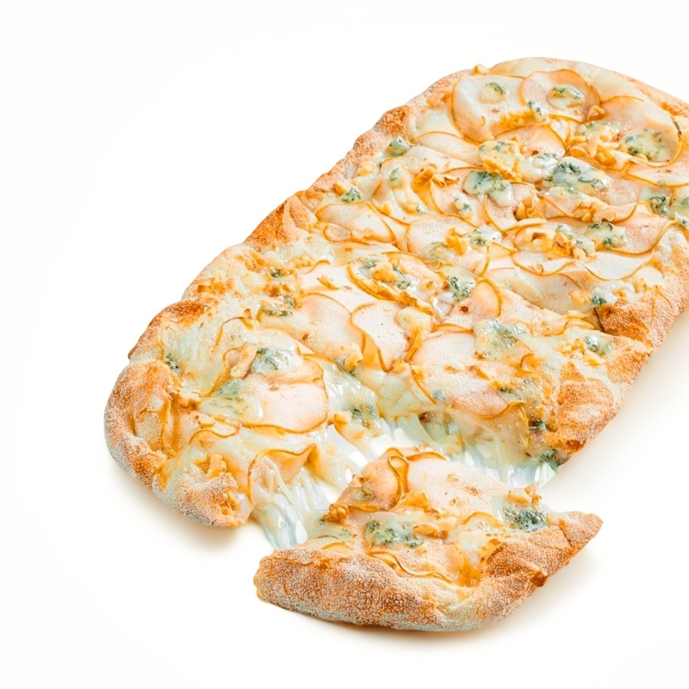 Основа для пиццы (мука пшеничная хлебопекарная в/с, вода питьевая, мука пшеничная ферментированная (мука пшеничная хлебопекарная в/с, комплексная пищевая добавка: (закваска пшеничная сухая, глютен пшеничный, антиокислитель Е300, технологическое вспомогательное средство ферментные препараты микробного происхождения), мука соевая, крупа манная, соль пищевая (содержит антислеживающий агент Е536)),сахар, дрожжи сухие (дрожжи,эмульгатор Е491,антиокислитель Е300), масло подсолнечное рафинированное дезодорированное первого сорта),сыр мягкий моцарелла (молоко нормализованное пастеризованное, масло сливочное, молочный белок, соль пищевая, закваска термофильных молочнокислых микроорганизмов, технологическое вспомогательное средство молокосвертывающий ферментный препарат микробного происхождения, регулятор регулятор кислотности Е 330, агент антислеживающий-Е551,консерват-Е202) , соус "Сырный" (молокосодержащий продукт с заменителем молочного жира, произведенный по технологии мягкого сыра (восстановленное молоко из сухого обезжиренного молока, масло сливочное, заменитель молочного жира (рафинированные дезодорированные растительные масла (пальмовое и его фракции, соевое), антиокислитель (Е306)), ароматизатор, культура заквасочная лиофилизированная концентрированная, технологическое вспомогательное средство молокосвёртывающий фермент микробного происхождения, загуститель Е407, соль, стабилизаторы (Е 410, Е412), вода питьевая, молоко сухое цельное, сыр творожный (нормализованное пастеризованное коровье молоко, молокосвертывающий фермент микробного происхождения, закваска бактериальная, стабилизатор Е 410, соль), загуститель (Е1422), комплексная пищевая добавка (эмульгаторы Е452i, Е450), соль, регуляторы кислотности (Е270, Е331iii), консервант Е202)), груша, сыр с голубой благородной плесенью с м.д.ж в сух в-ве 50% (молоко пастеризованное, соль поваренная пищевая, бактериальная закваска (термофильных и мезофильных молочнокислых микрооганизмов, уплотнитель: хлорид кальция, культура благородной плесени Penicillium roqueforti), острый мед (мед цветочный, красный перец), грецкий орех, приправа из цитрусовых плодов (вода питьевая очищенная, концентрированный лимонный сок, свекловичный сахар, регулятор кислотности Е300, соль поваренная пищевая, натуральный ароматизатор "Лимон", консервант Е211)