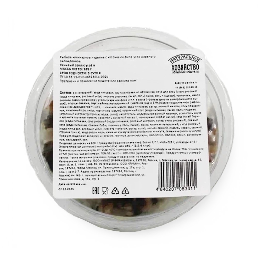 рис отварной (вода питьевая, крупа рисовая шлифованная, соус для риса (уксус рисовый (вода питьевая, рисовый уксус, кислота уксусная, сахар, соль) сахар, соль пищевая), трегалоза, масло рисовое рафинированное), угорь (жареное филе угля в соусе (произведено из замороженного сырья)), огурцы свежие, соус майонезно-устричный (майонез м.д.ж 67% (масло подсолнечное рафинированное дезодорированное, оливковое масло, вода питьевая, сахар, яичный желток, соль поваренная, лимонный сок, уксус, горчичное масло), устричный соус (вода питьевая, сахар, соль пищевая, устричный экстракт (устрицы, вода, соль)), загуститель модифицированный крахмал, усилитель вкуса и аромата глутамат натрия, краситель сахарный колер I , консервант сорбат калия), соус Амай Терияки (вода питьевая, соус рисовый (вода питьевая, рисовый экстракт, сахар, уксус рисовый), соевый соус (вода питьевая, соевые бобы, пшеница, соль, сахар), сахар, крахмал кукурузный, уксус рисовый (вода питьевая, рисовый уксус, кислота уксусная, сахар, соль), чеснок свежий, имбирь корень свежий, стружка тунца), водоросли нори, семена кунжута (семена белого кунжута, семена черного кунжута).