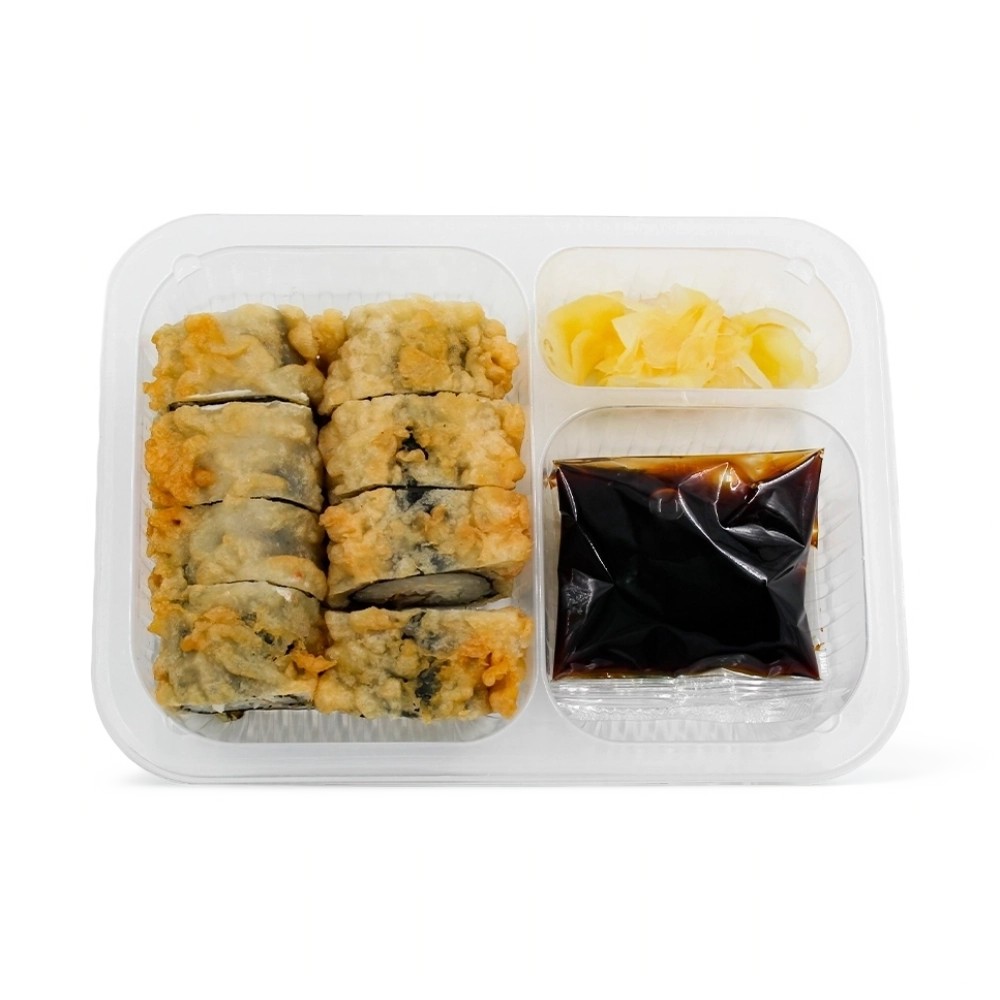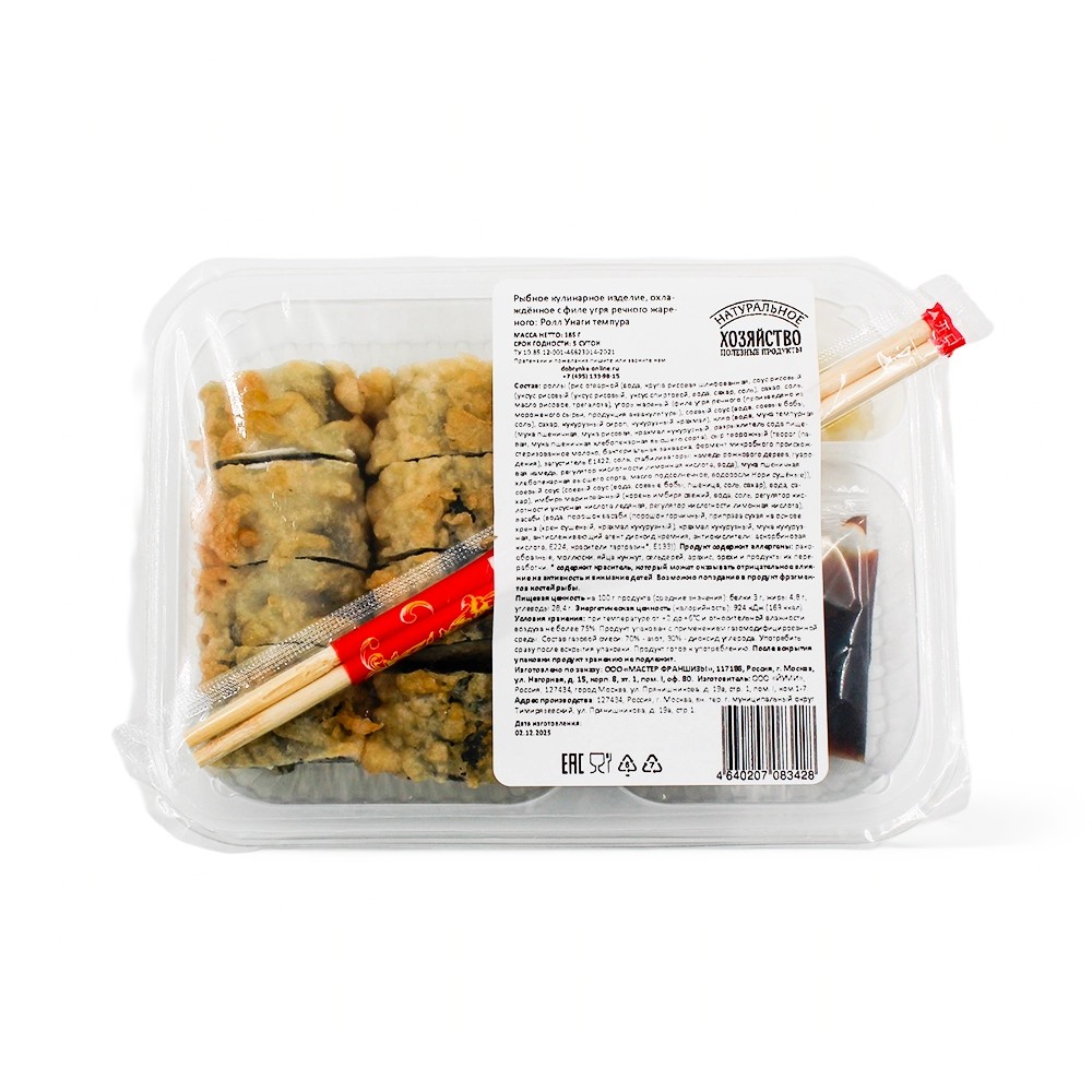 роллы (рис отварной (вода, крупа рисовая шлифованная, соус рисовый (уксус рисовый (уксус рисовый, уксус спиртовой, вода, сахар, соль), сахар, соль, масло рисовое, трегалоза), угорь жареный (филе угря речного (произведено из морожено-го сырья, продукция аквакультуры), соевый соус (вода, соевые бобы, соль), сахар, кукурузный сироп, кукурузный крахмал), кляр (вода, мука темпурная (мука пшенич-ная, мука рисовая, крахмал кукурузный, разрыхлитель сода пищевая, мука пшенич-ная хлебопекарная высшего сорта), сыр творожный (творог (пастеризованное молоко, бактериальная закваска, фермент микробного происхождения), загуститель Е1422, соль, стабилизаторы: камедь рожкового дерева, гуаровая камедь, регулятор кислотности лимонная кислота, вода), мука пшеничная хлебопекарная высшего сорта, масло подсолнечное, водоросли Нори сушёные)), соевый соус (соевый соус (вода, соевые бобы, пшеница, соль, сахар), вода, сахар), имбирь маринованный (корень имбиря свежий, вода, соль, регулятор кислотности уксусная кислота ледяная, регулятор кислотности лимонная кислота), васаби (вода, порошок васаби (порошок горчичный, приправа сухая на основе хрена (хрен сушеный, крахмал кукурузный), крахмал кукурузный, мука кукурузная, антислеживающий агент диок-сид кремния, антиокислители: аскорбиновая кислота, Е224, красители тартразин*, Е133))