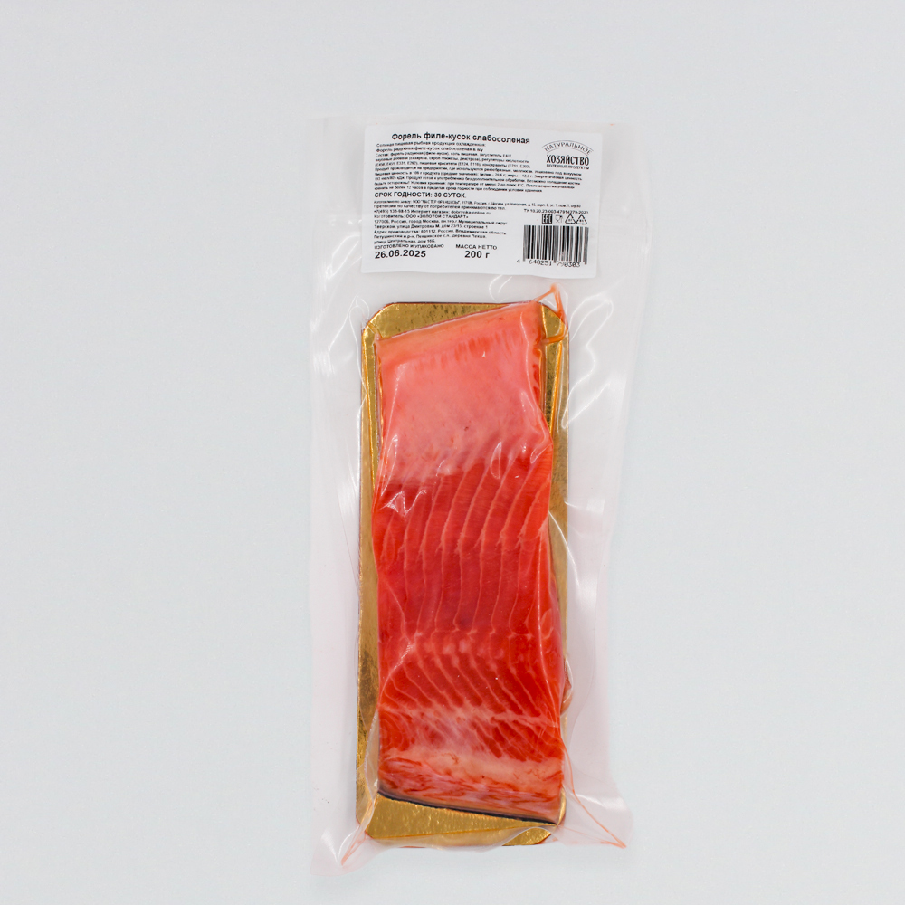 форель радужная (филе-ломтики), соль пищевая, загуститель Е407, вкусовые добавки (сахароза, сироп глюкозы,декстроза), регуляторы кислотности (Е450,Е 451, Е331, Е 262), пищевые красители ( Е 124, Е 110), консерванты ( Е 211, Е 202).