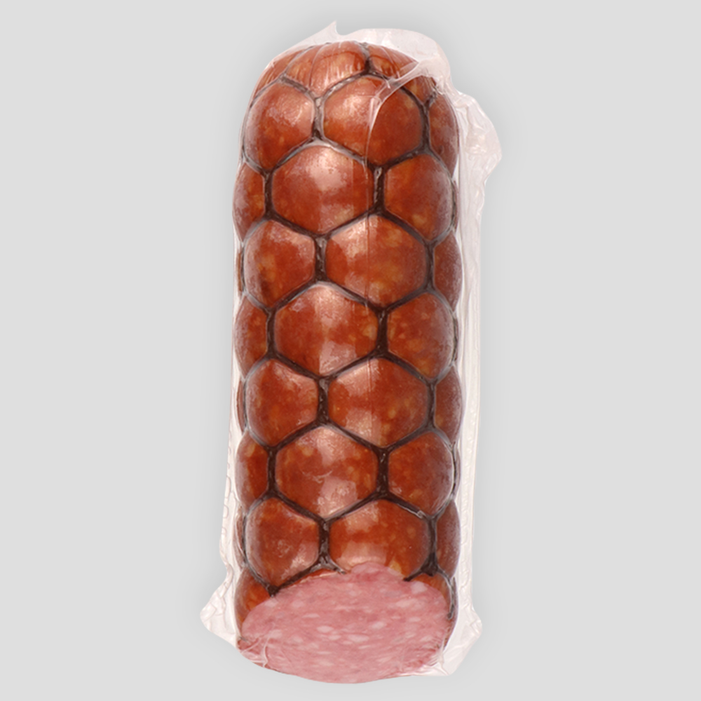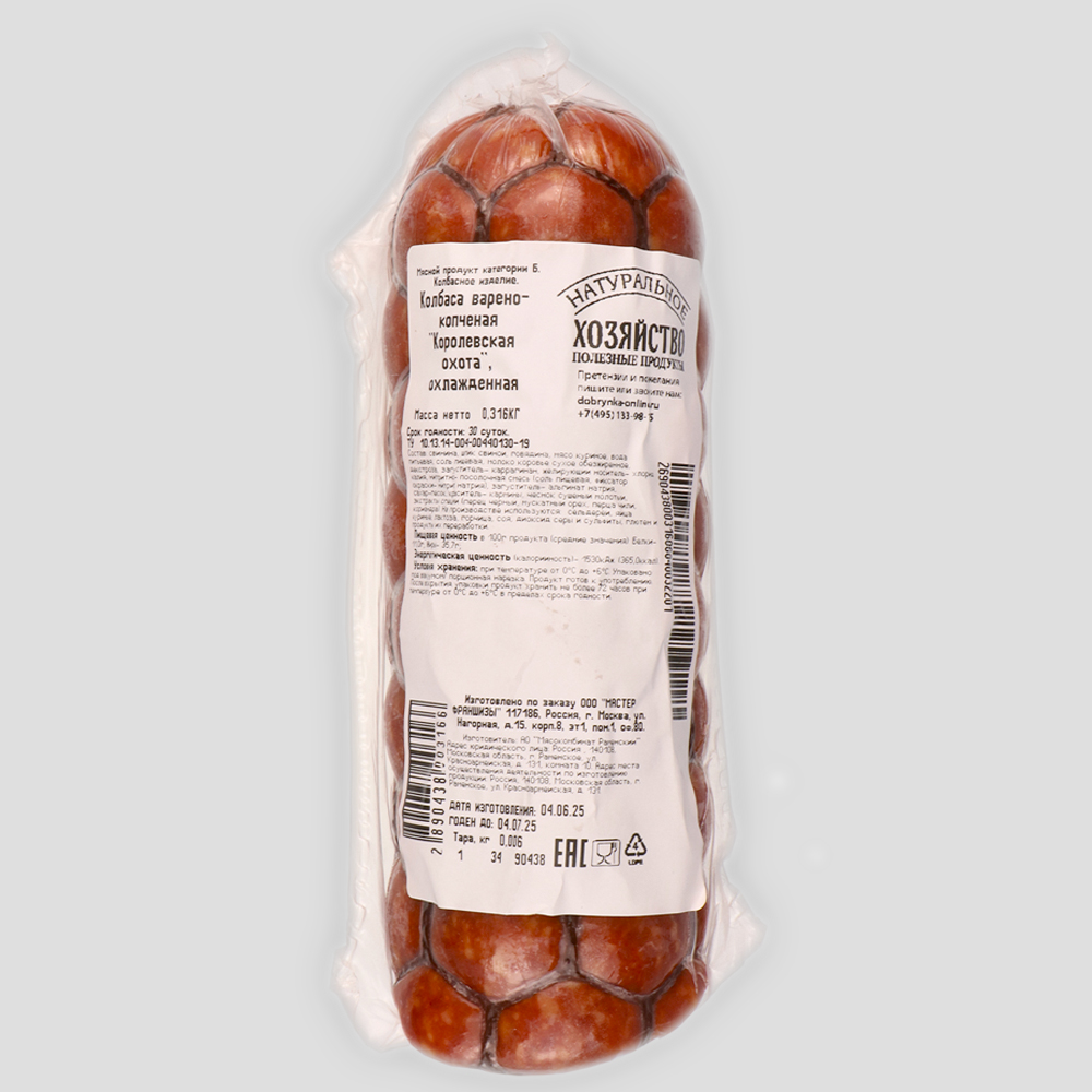Почувствуйте благородный вкус охотничьих традиций: сочные кусочки отборной свинины и говядины, томлёные с ароматными специями под натуральной оболочкой. Это не просто колбаса – это произведение мясного искусства с дымным шармом!
