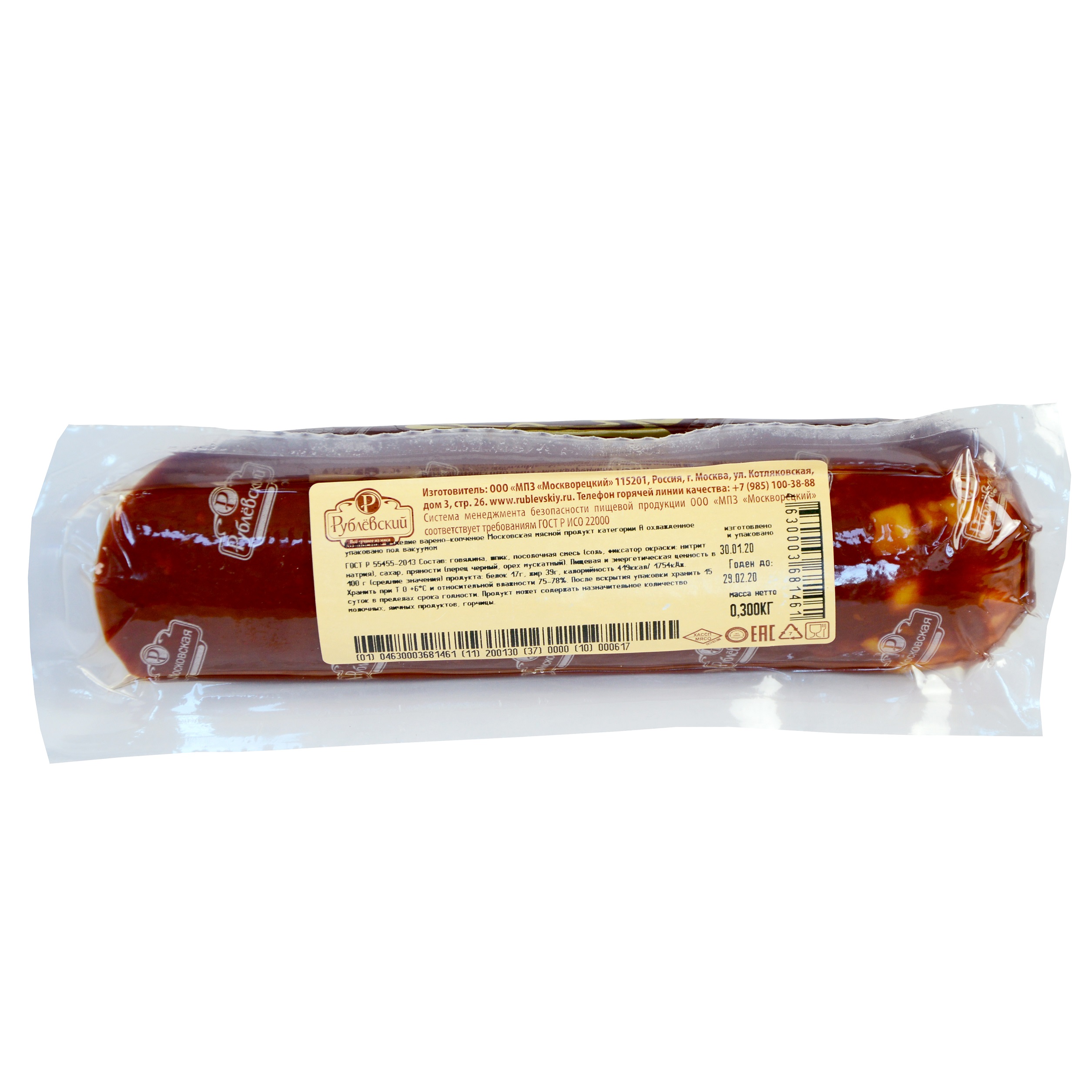 Московская» колбаса – классика варено-копченых колбас. Уникальность колбасе придают черный перец и кардамон, которые раскрываются в сочетании с ярким говяжьим вкусом вместе с ароматом копчения. В рецептуру, которая не менялась на протяжении вековой истории продукта, входит только говядина высшего сорта и свиной шпик.