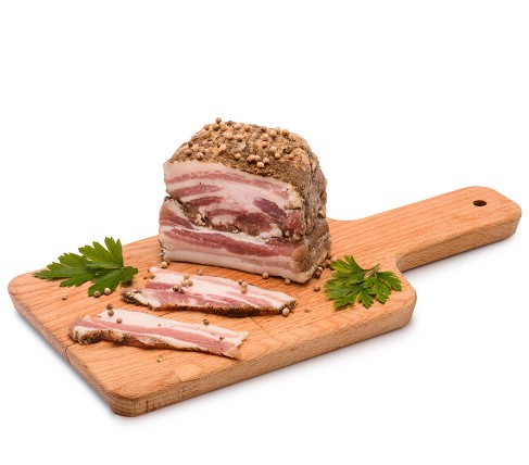 Свиной, соль, пряности натуральные (перец черный молотый, чеснок сушеный, кориандр (зерно), тмин молотый, лавровый лист).