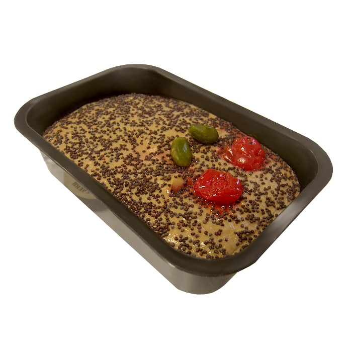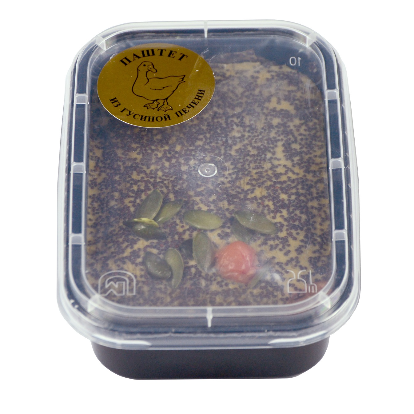 Нежный паштет ручной работы с гусиной печенью, украшенный маком, вяленой вишней и тыквенными семечками.