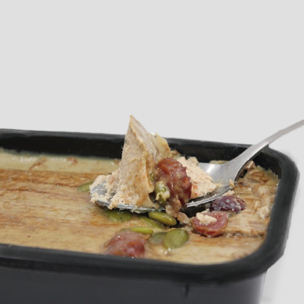Свинина, печень индейки, вода питьевая, шпик свиной меланж яичный, груша сушеная, клюква сушеная, комплексная пищевая добавка (декстроза, зкстракты пряностей, лук сушеный, антиокислитель (аскорбиновая кислота)), семена тыквы очищенные, соль пищевая, сироп глюкозы, Продукт может содержать незначительное количество говядины, печени утиной и курыной, горчицы, сельдерея, орехов, сои, молока, злаков, содержащих глютен.