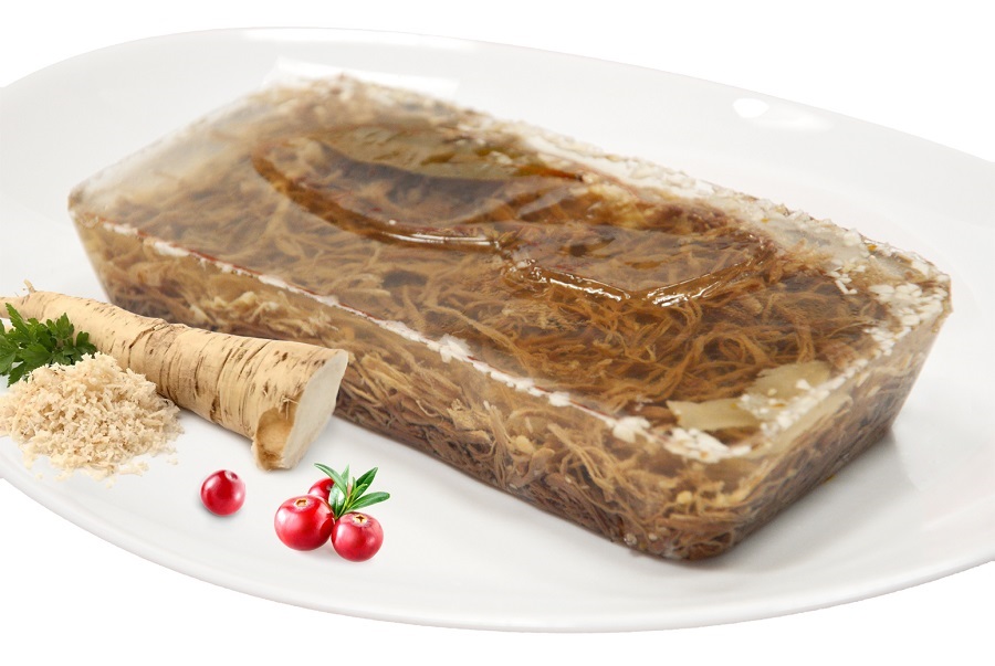 Говядина, бульон мясной, вода, желатин пищевой, соль поваренная, чеснок сушеный, хрен сушеный, перец душистый, перец черный, лавровый лист. Возможно незначительное содержание молочных и яичных продуктов, глютена, орехов.