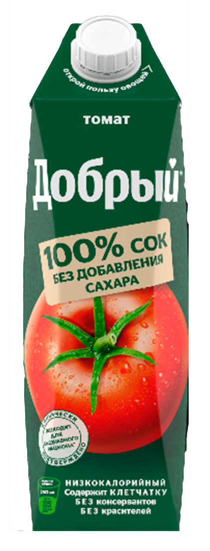 Добрый Томат 100% сок без консервантов и красителей в удобной упаковке для семейного обеда или ужина., Упаковка продукта может быть в цветном или белом виде.