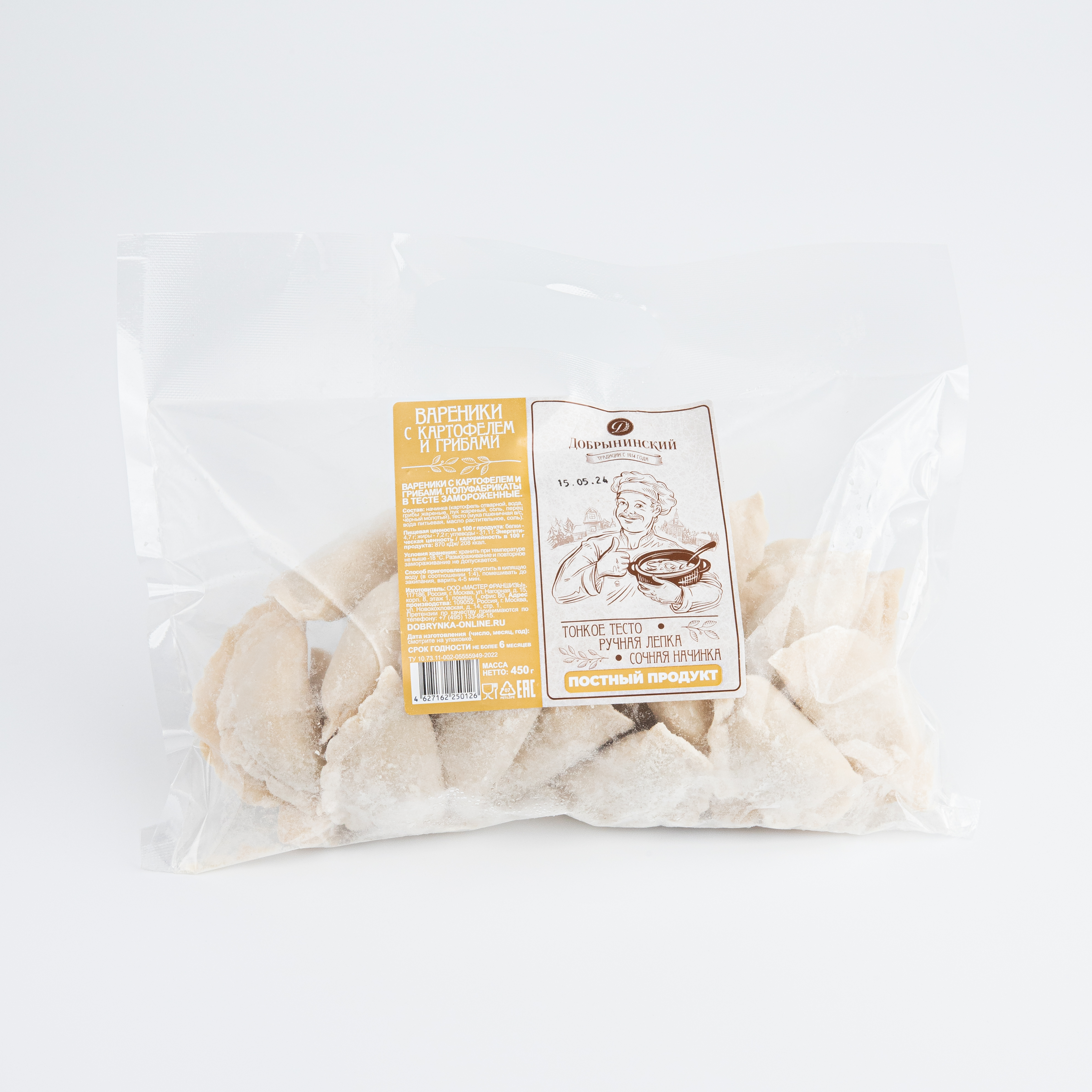 Состав: начинка (картофель, грибы шампиньоны, лук репчатый, масло подсолнечное рафинированное, соль,перец черный молотый), тесто (мука пшеничная в/с, вода питьевая, яйца куриные, масло подсолнечноерафинированное, соль).