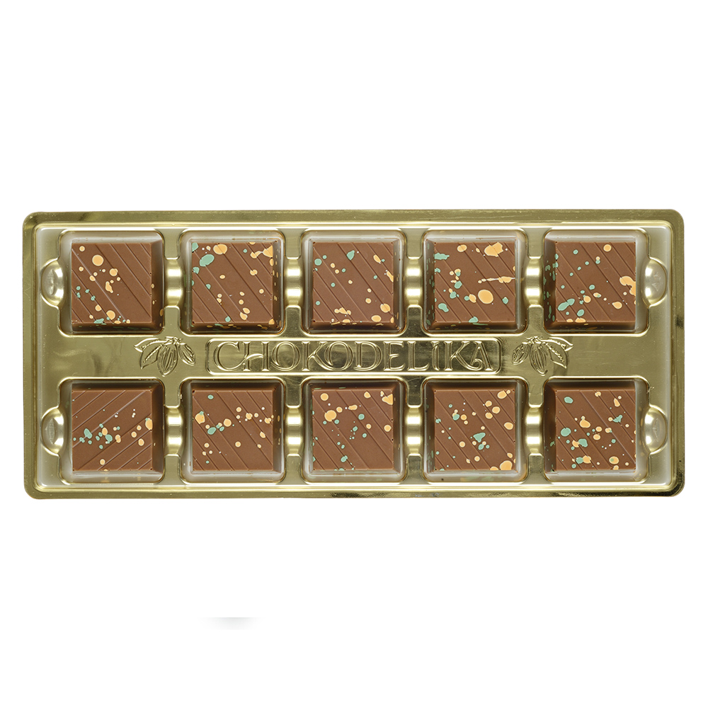 молочный шоколад (сахар, масло какао, цельное сухое молоко, какао тертое, эмульгатор: соевый лецитин, натуральный ароматизатор ванильный), паста фисташки жареной, тесто «Катаифи», шоколад белый (сахар, какао масло, цельное сухое молоко, эмульгатор: соевый лецитин, натуральный ароматизатор ванильный), какао – масло, пищевой краситель «диоксид титана», натуральные красители «медные комплексы хлорофиллов», «бета-каротин», соль.