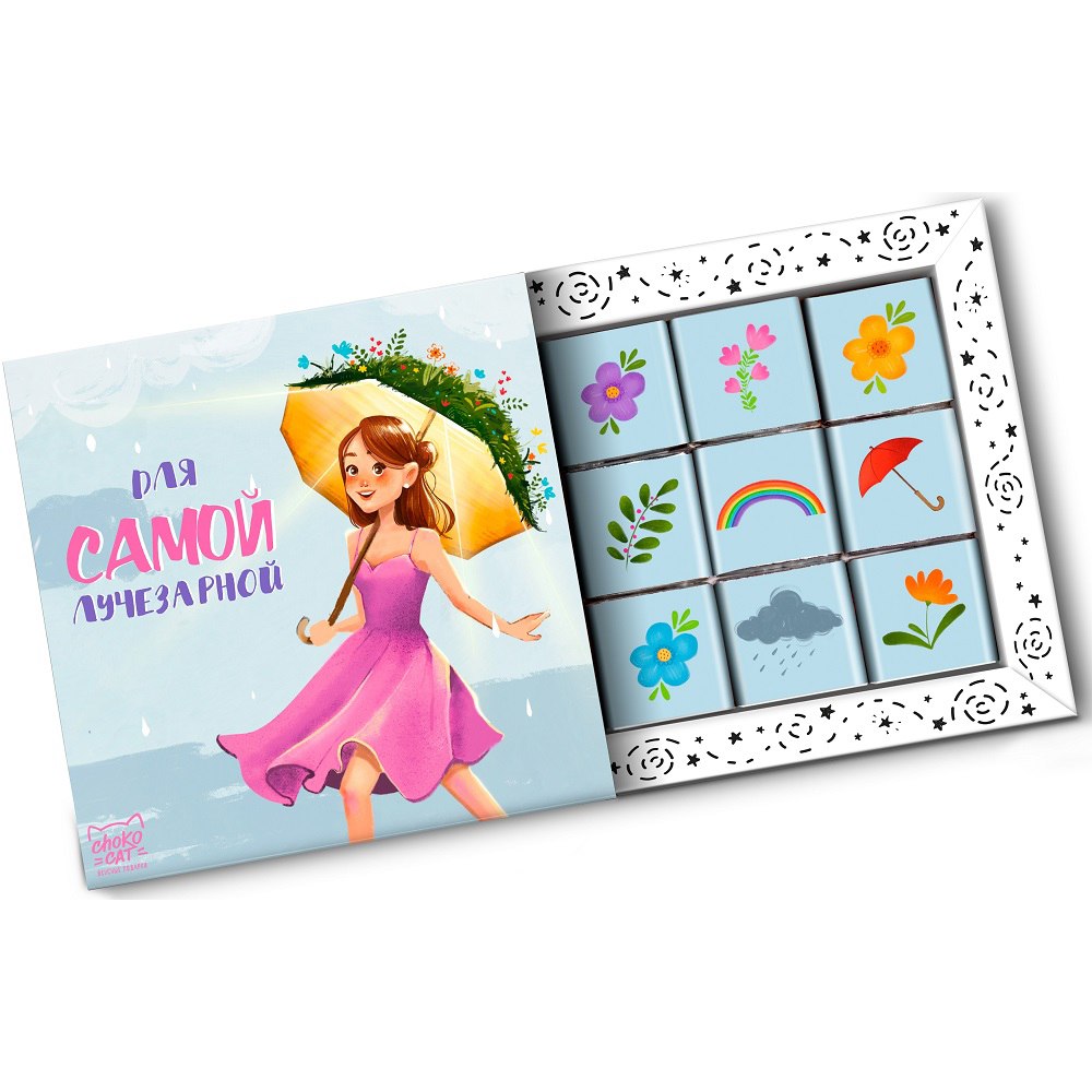 Набор с 9 молочными шоколадками, где каждая плитка завернута в красочную этикетку со своим индивидуальным дизайном и приятным посланием.