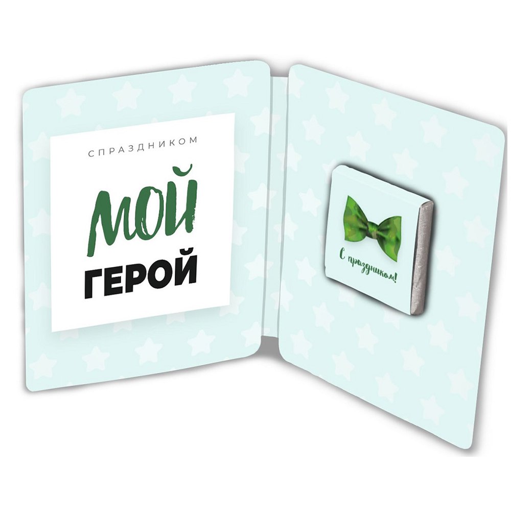 Мини открытка, внутри которой плитка молочного шоколада. Плитка обернута в этикетку с оригинальной иллюстрацией.