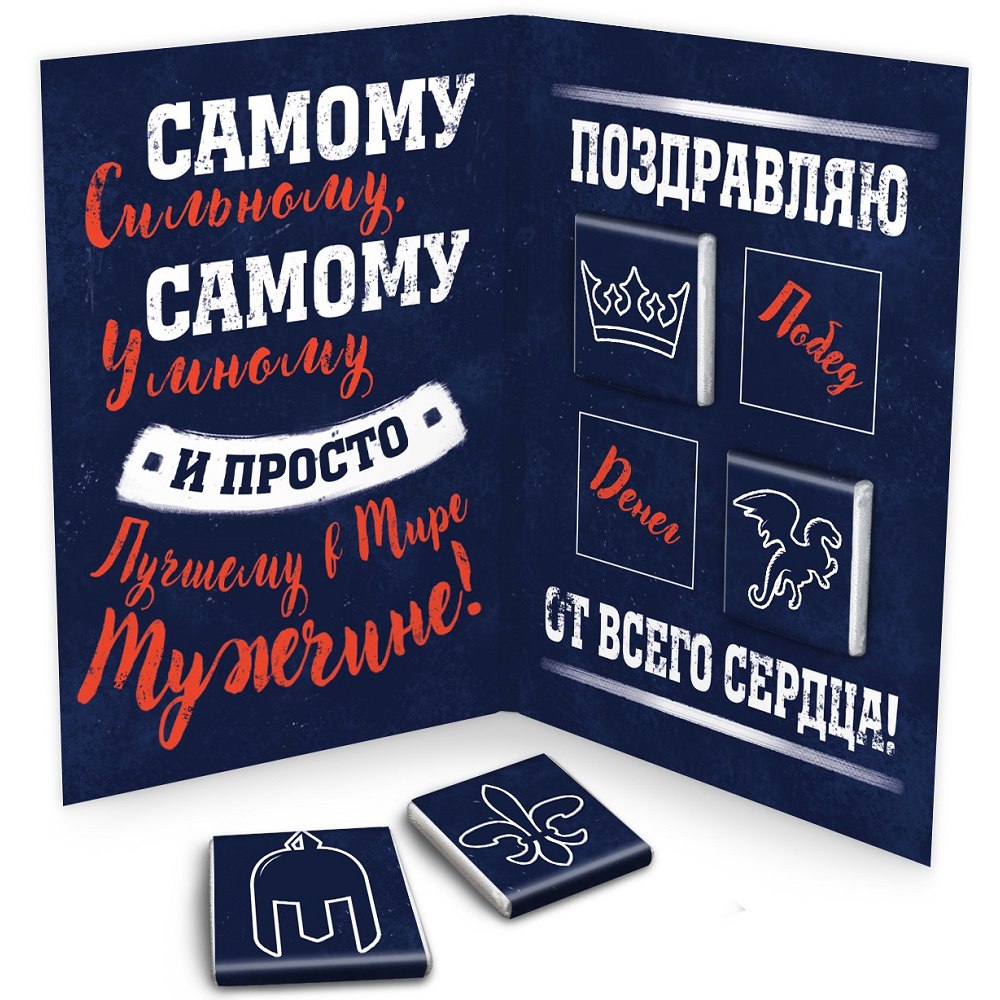 Яркая и современная открытка, внутри которой 4 плитки молочного шоколада. Каждая плитка обернута в этикетку с оригинальной иллюстрацией.