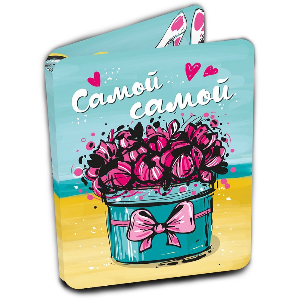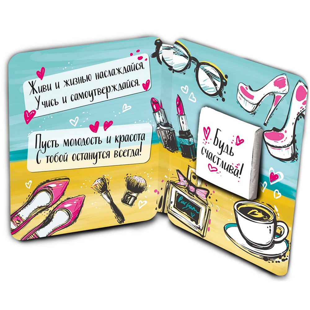 Мини открытка, внутри которой плитка молочного шоколада. Плитка обернута в этикетку с оригинальной иллюстрацией.
