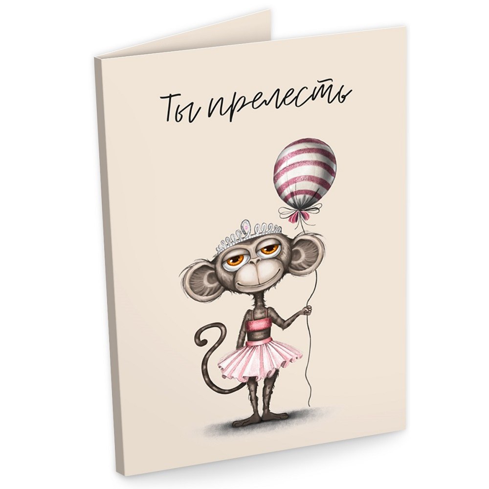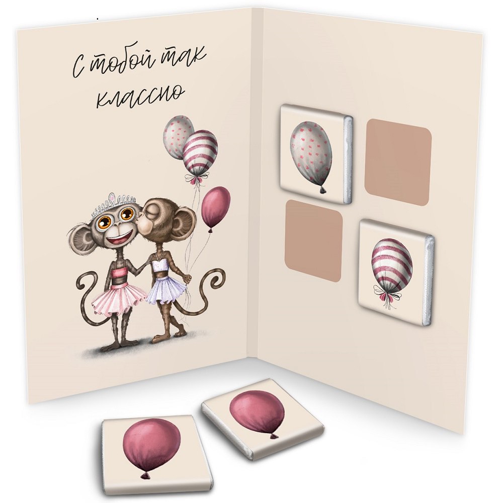 Яркая и современная открытка, внутри которой 4 плитки молочного шоколада. Каждая плитка обернута в этикетку с оригинальной иллюстрацией.
