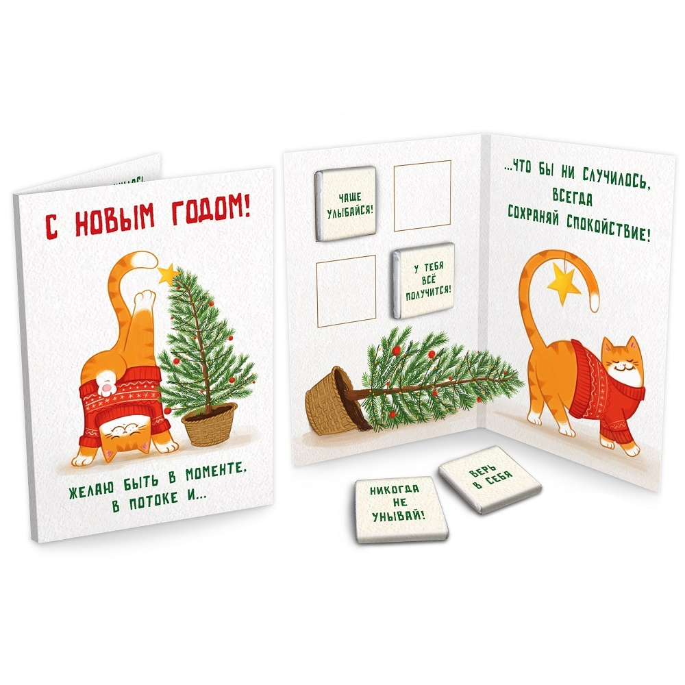 Яркая и современная открытка, внутри которой 4 плитки молочного шоколада. Каждая плитка обернута в этикетку с оригинальной иллюстрацией.