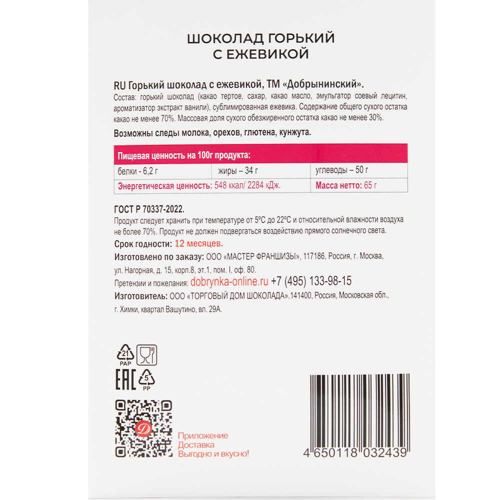 Горький шоколад (какао тертое, сахар, какао масло, эмульгатор соевый лецитин, ароматизатор экстракт ванили), сублимированная ежевика. Содержание общего сухого остатка какао не менее 70%. Массовая доля сухого обезжиренного остатка какао не менее 30%.