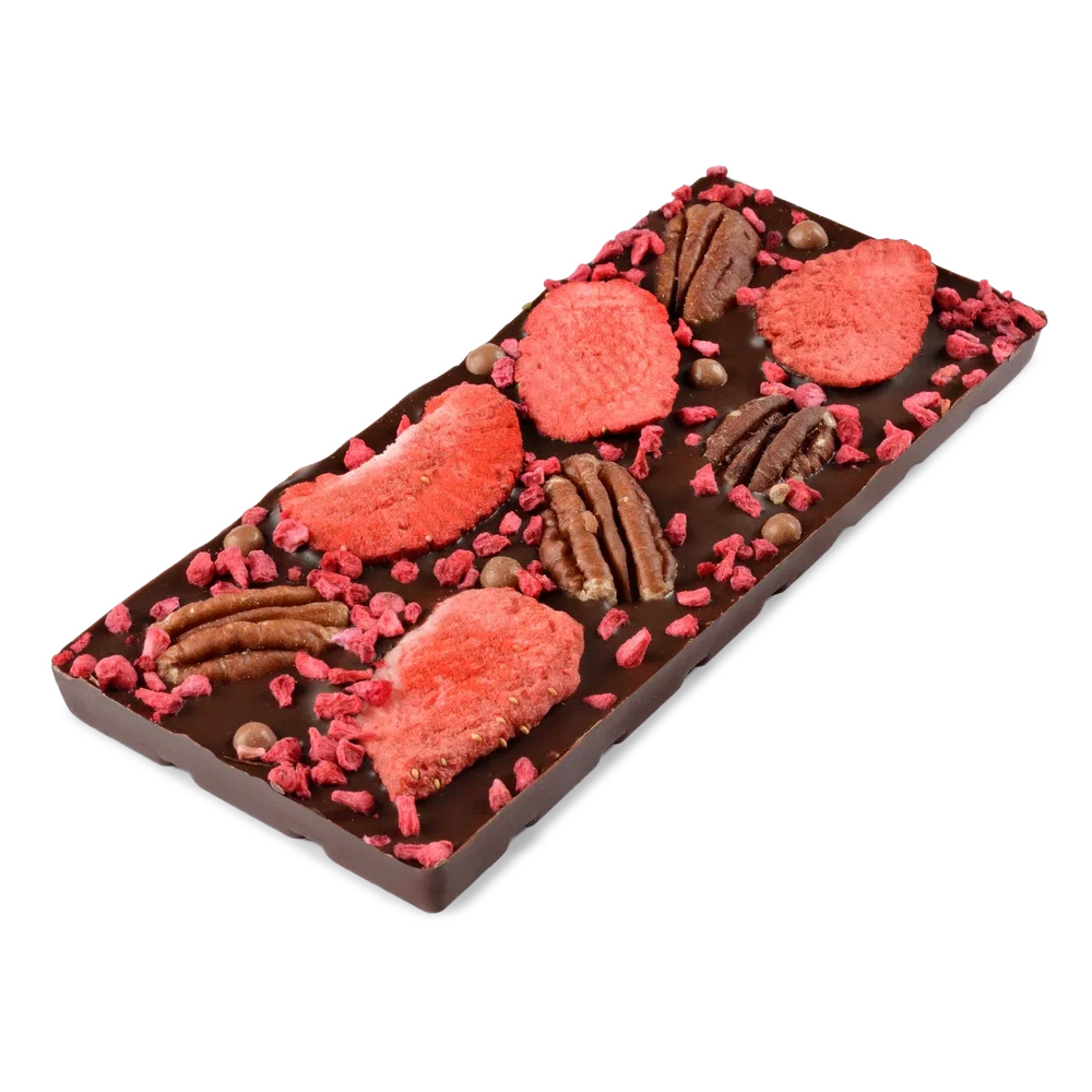 Темный шоколад с украшением "Клубника, Пекан, Малина" — это сто грамм настоящего буйства вкуса! Отборный пекан в сочетании с сублимированными ягодами клубники и малины и темный шоколад высочайшего качества подарят минуты наслаждения. А в сочетании с чашечкой ароматного кофе или чая время, проведенное за угощением, станет незабываемым.