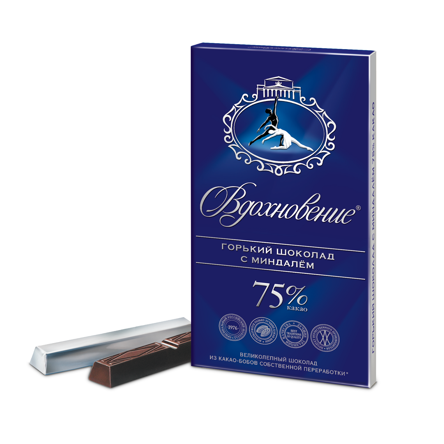 Элитный горький шоколад «Вдохновение» для настоящих ценителей шоколадного вкуса. В каждой «палочке» шоколада содержится 75% какао. Его терпкая горечь с насыщенным вкусом какао дополнена дробленым в крошку миндалем. Его ореховая сладость растворяется в многогранном шоколадном вкусе, смягчая его и придавая более утонченный и изысканный аромат.