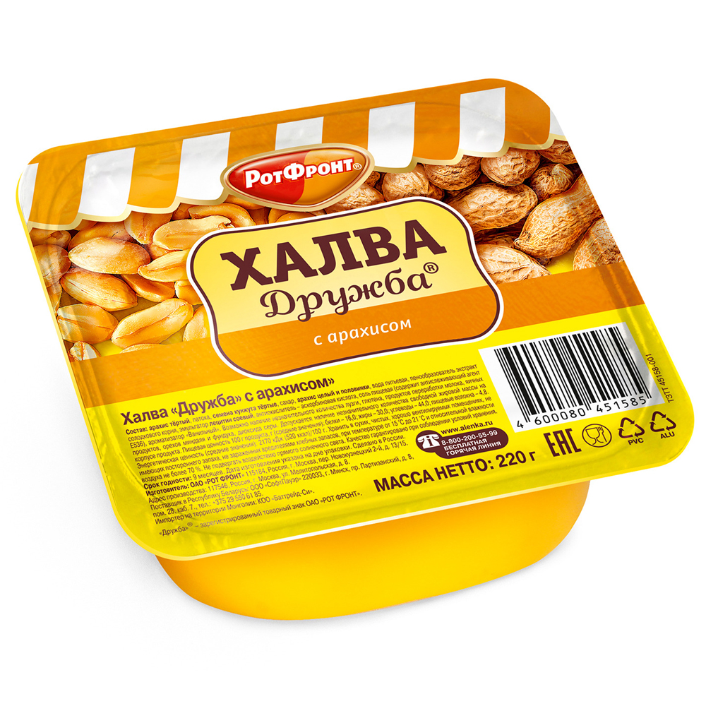 Ароматная тахинно-арахисовая халва «Дружба» от фабрики «Рот Фронт» с добавлением крупных арахисовых орехов. Насыщенный многогранный вкус: переплетение пикантного вкуса арахиса, терпкого кунжутного духа, легких ноток ванили и нежной сахарно-медовой сладости. Тонкую слоистую структуру тающей халвы дополняют хрустящие ядра арахиса.