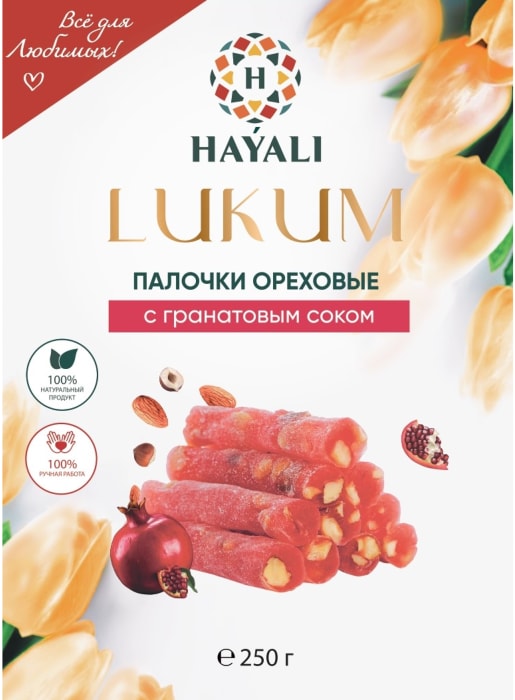 Эти ореховые угощения с добавлением гранатового сока подарят вам неповторимый вкус и аромат, способные перенести вас в атмосферу восточного базара. Каждый кусочек — это мягкость и нежность, обрамленные хрустящими орехами и насыщенным вкусом граната. Лукум HAYALI — это отличный подарок на праздники или просто способ побаловать себя и своих близких чем-то особенным. Позвольте себе насладиться этой сладкой находкой и откройте для себя новый уровень наслаждения!