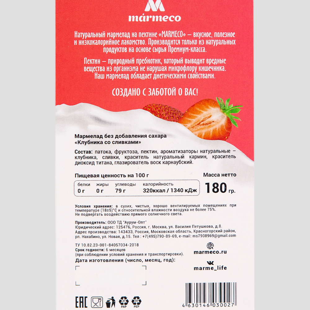 Патока, фруктоза, пектин, ароматизаторы натуральные - клубника, сливки, краситель натуральный кармин, краситель диоксид титана, глазирователь воск карнаубский.