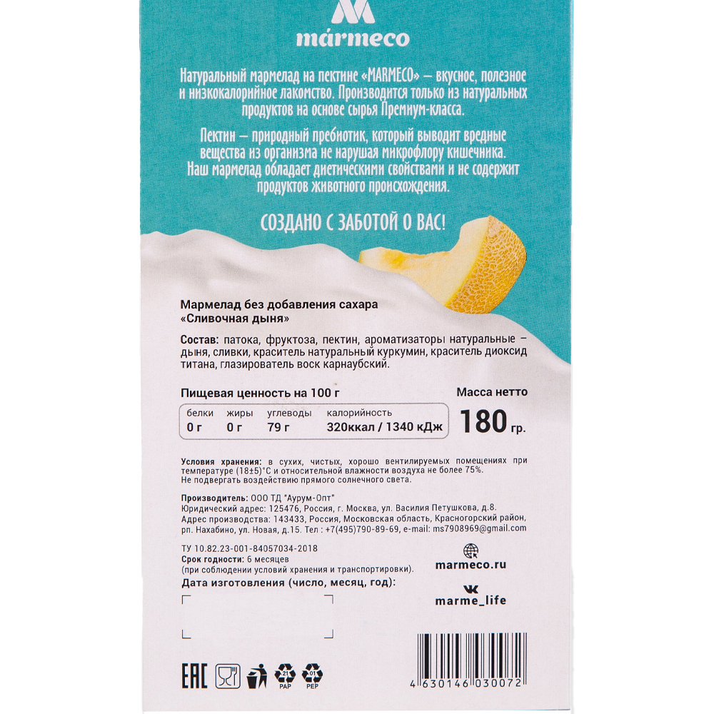 Патока, фруктоза, пектин, ароматизаторы натуральные - дыня, сливки, краситель натуральный куркумин, краситель диоксид титана, глазирователь воск карнаубский.