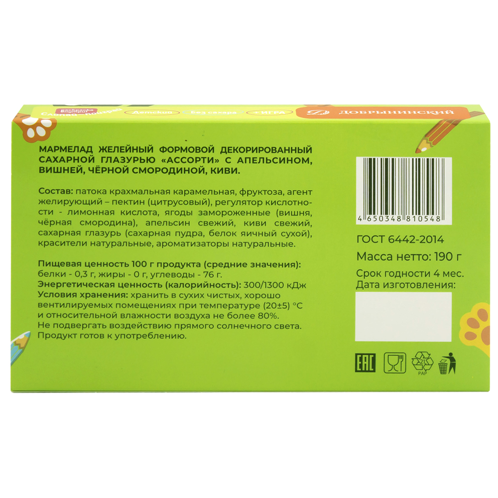 Патока крахмальная карамельная, агент желирующий - пектин (цитрусовый), регулятор кислотности - лимонная кислота, ягоды замороженные (вишня, черная смородина), апельсин свежий, киви свежий, сахарная глазурь (сахарная пудра белок яичный сухой), красители натуральные, ароматизаторы натуральные.