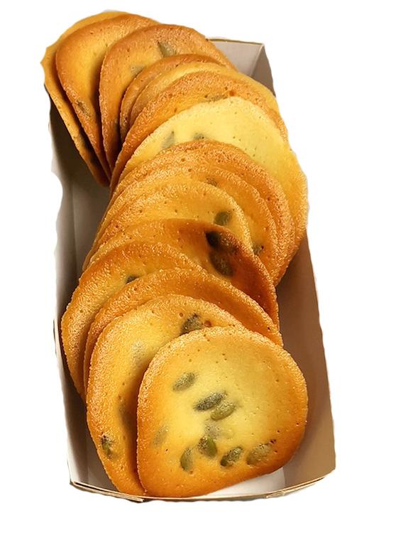 Твёрдое печенье необычной формы в виде чипсов со вкусными и полезными тыквенными семечками.